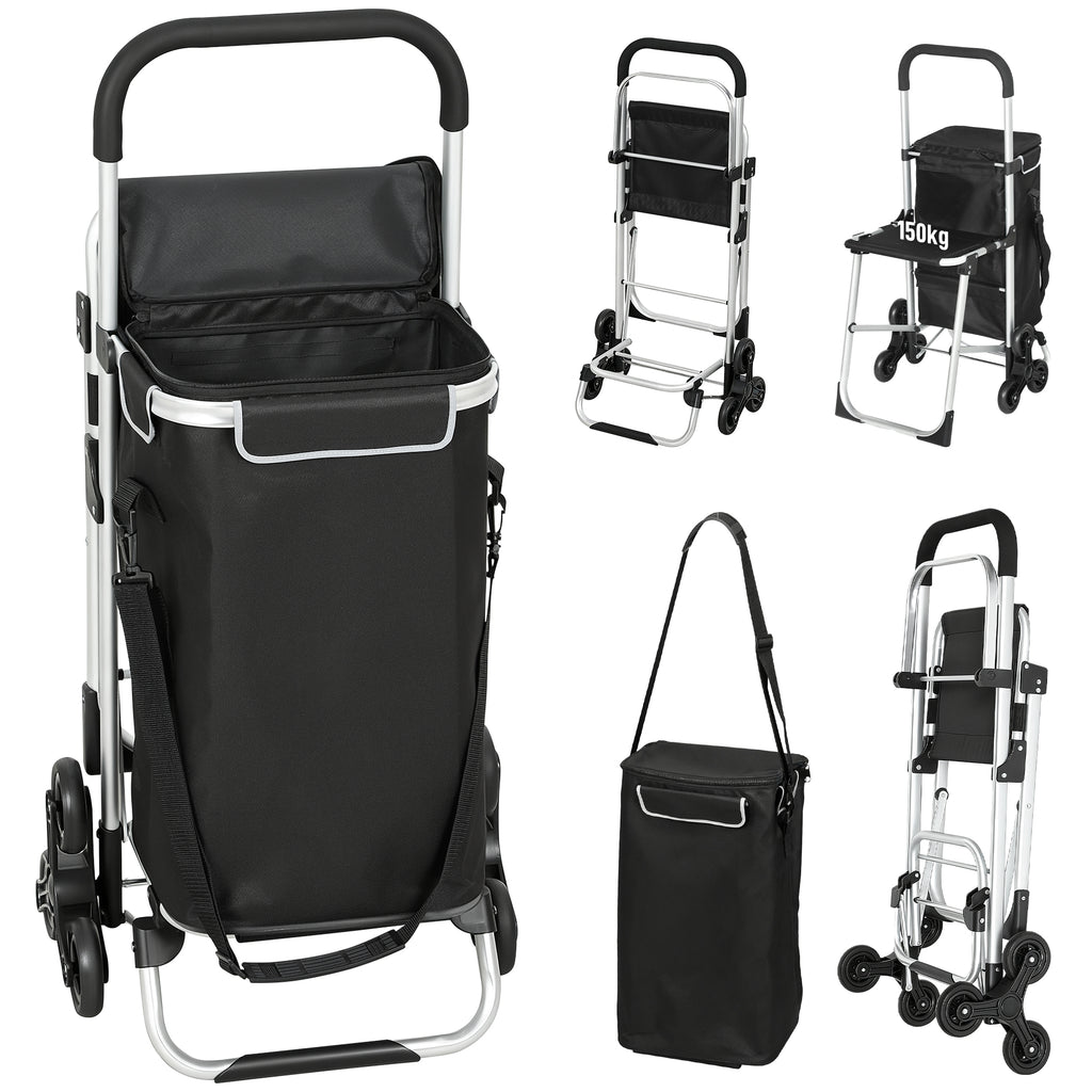 Carrello della Spesa 46x59.5x97 cm con Borsa da 40L Impermeabile e Sedile in Alluminio Nero e Argento