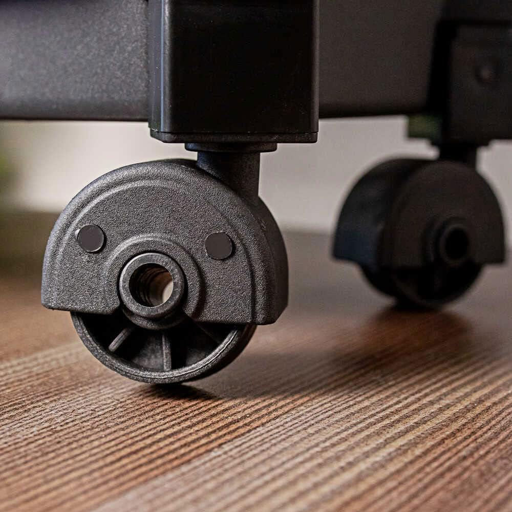 Dotato di quattro rotelle per spostarlo facilmente e tre ripiani portaoggetti..