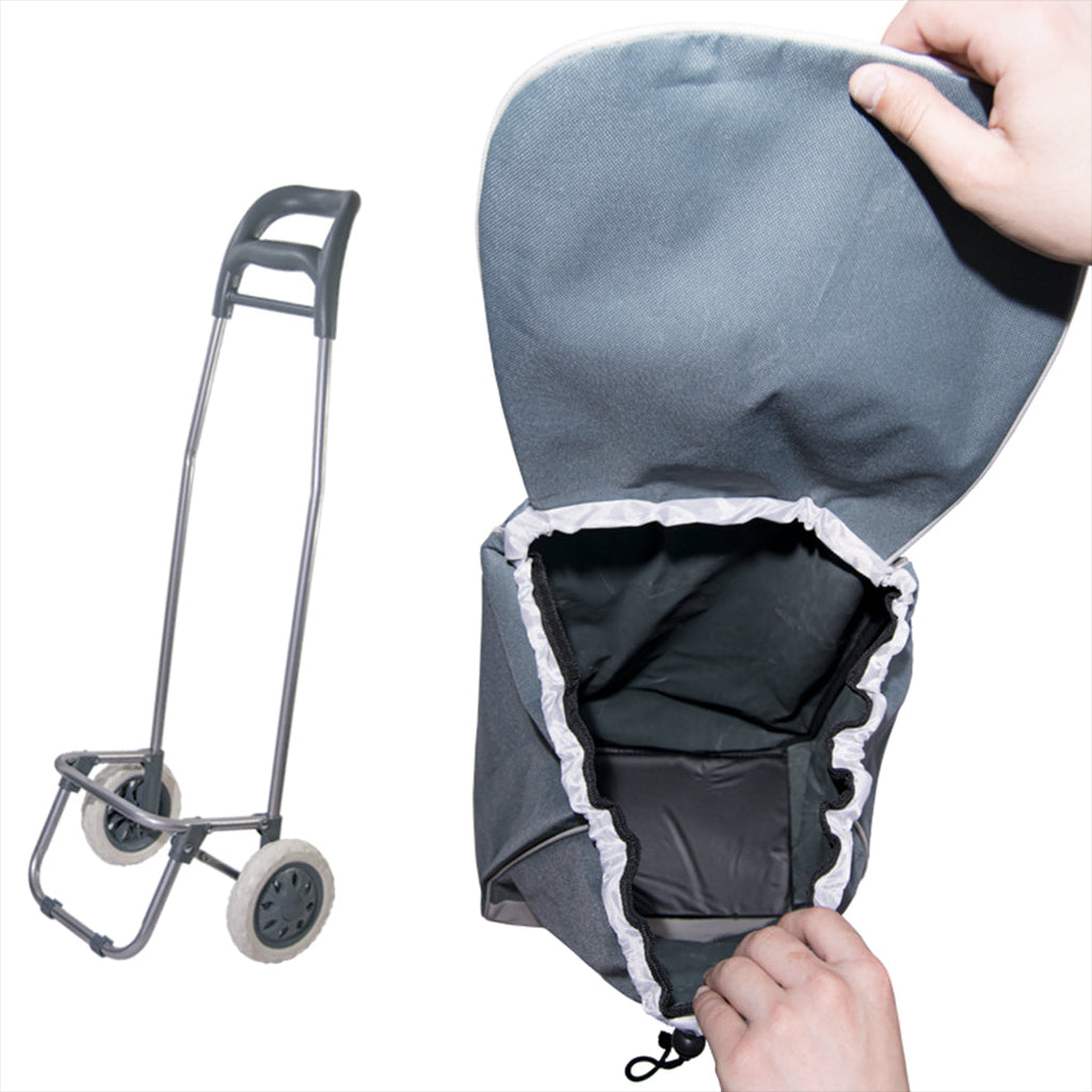 Ce chariot très pratique se compose d'un sac amovible en polyester enduit PVC gris et d'un cadre en aluminium avec roulettes amovibles.La structure du cadre est très légère mais à la fois robuste et résistante, de plus, elle se ferme facilement pour ne pas être encombrante et puis posez-le n'importe où.