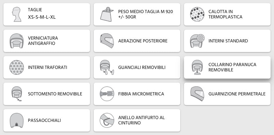Fabriqué avec la coque la plus compacte et la plus légère de la catégorie, parmi ses principales caractéristiques, le col amovible avec fermeture éclair et le porte-lunettes arrière pour loger les lunettes de casque. Le 104A est produit sans visière ni visière , les petites dimensions permettent un rangement facile dans tous les compartiments sous la selle des scooters.