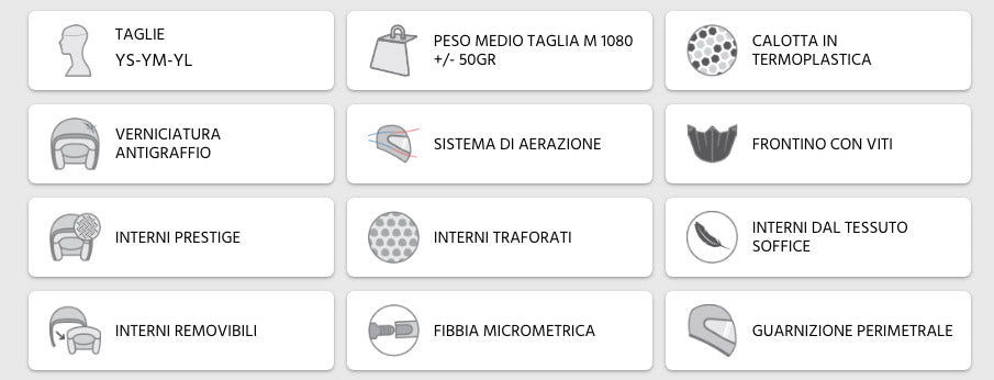 Le 209 est un cross pour enfant réalisé avec une coque spécialement créée. Il ne renonce pas aux caractéristiques techniques des casques pour adultes telles que le système de ventilation composé de prises d'air sur la mentonnière, de prises d'air supérieures et d'extracteurs d'air arrière. La version 209G est faite avec des graphismes modernes et colorés.