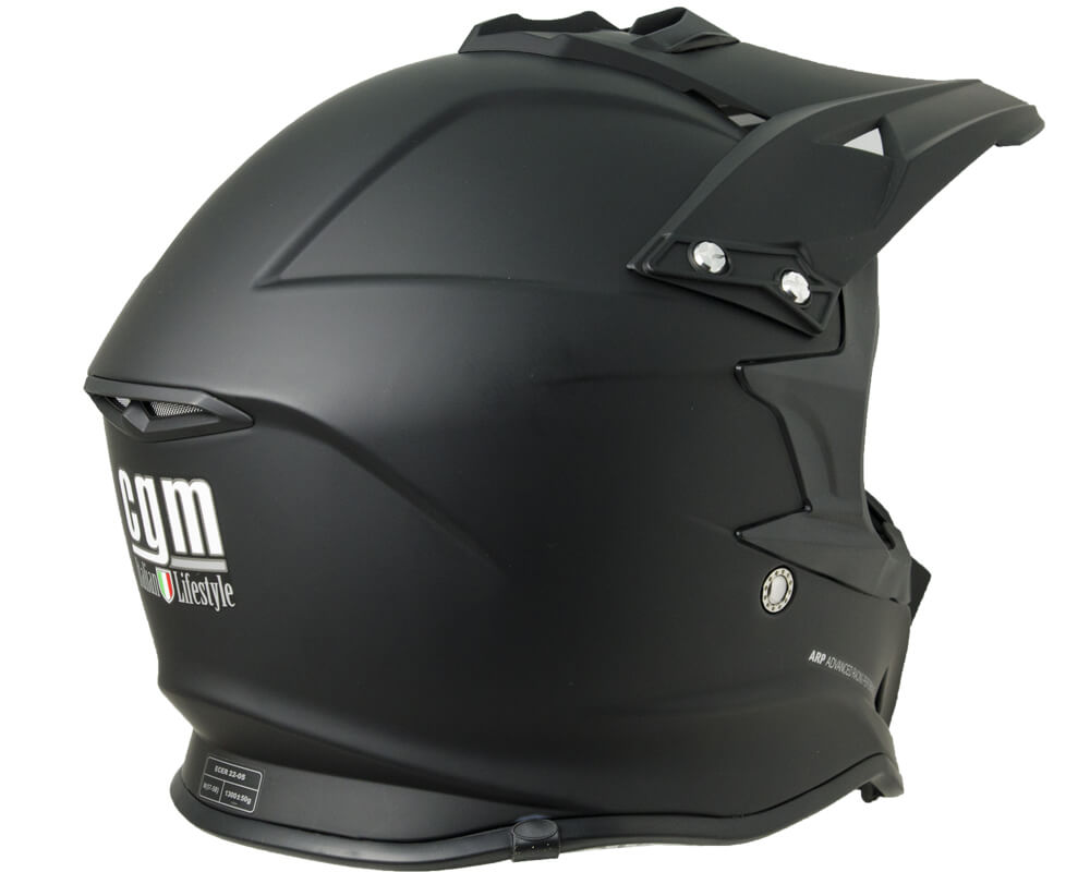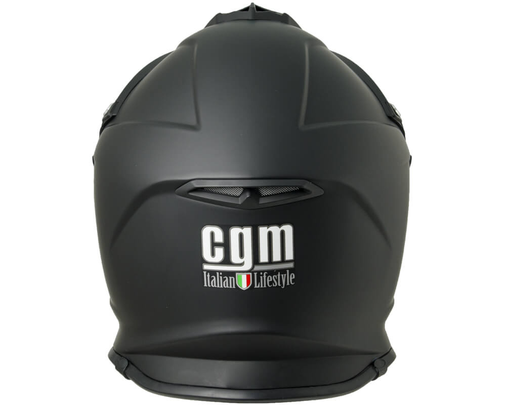 Casque cross CGM fabriqué avec une coque au design extrêmement agressif qui a été conçue pour s'adapter au col stabilisateur. Ce casque est doté d'aérations avec filet visible et d'une protection anti-poussière à l'avant et sur les côtés de la mentonnière ainsi que sous la visière. L'intérieur et les coussinets de joues sont entièrement amovibles et lavables, la sangle a une fermeture à double anneau. Dans la version unicolore, il est disponible en noir mat avec une visière peinte et des garnitures assorties.