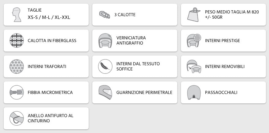 Le Casque Jet pour Scooters, Motos et Quads 170 est le Remake de la coque classique des années 70 mais léger car il est en fibre de verre et avec un petit volume (grâce à la disponibilité de trois tailles de coques extérieures).