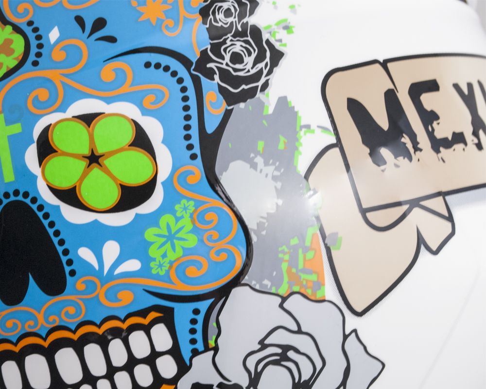 Chacun de nos casques est soigneusement traité pour obtenir la finition souhaitée. La coque, après avoir été lissée, est peinte de différentes couches de couleur, recouverte de la décalcomanie à l'eau appropriée avec le dessin souhaité, puis recouverte d'un vernis transparent résistant aux rayures.