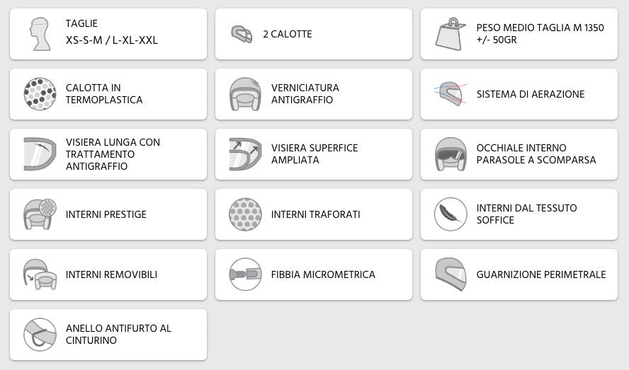 Fabriqué en deux tailles de coque extérieure pour améliorer le confort de chaque taille, il est équipé d'une longue visière extérieure pour une meilleure protection contre le vent et de verres intérieurs rétractables extra-fumés. Il est également équipé d'un système de ventilation qui utilise les entrées d'air avant pour canaliser l'air à l'intérieur du casque et expulser l'air chaud des extracteurs arrière. L'intérieur perforé, amovible et lavable est enrichi de bandes rétroréfléchissantes pour améliorer la sécurité passive. Les lignes modernes et aérodynamiques de ce jet sont soulignées par un graphisme sportif en trois couleurs différentes.