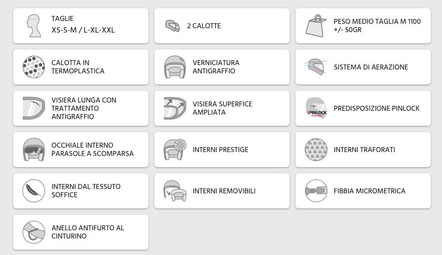 Fabriqué en deux tailles de coque extérieure, pour améliorer le confort de chaque taille, il est équipé d'une longue visière externe, qui s'étend jusqu'à couvrir le menton, avec une prédisposition de lentille PINLOCK. Il a des verres rétractables internes supplémentaires fumés ajustés en tournant la plaque gauche du casque. Il est également équipé d'un système de ventilation qui utilise les entrées d'air avant et les extracteurs arrière, avec des intérieurs perforés, amovibles et lavables, enrichis de bandes réfléchissantes arrière pour améliorer la sécurité passive.
