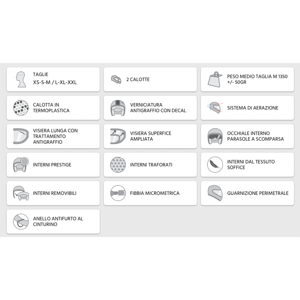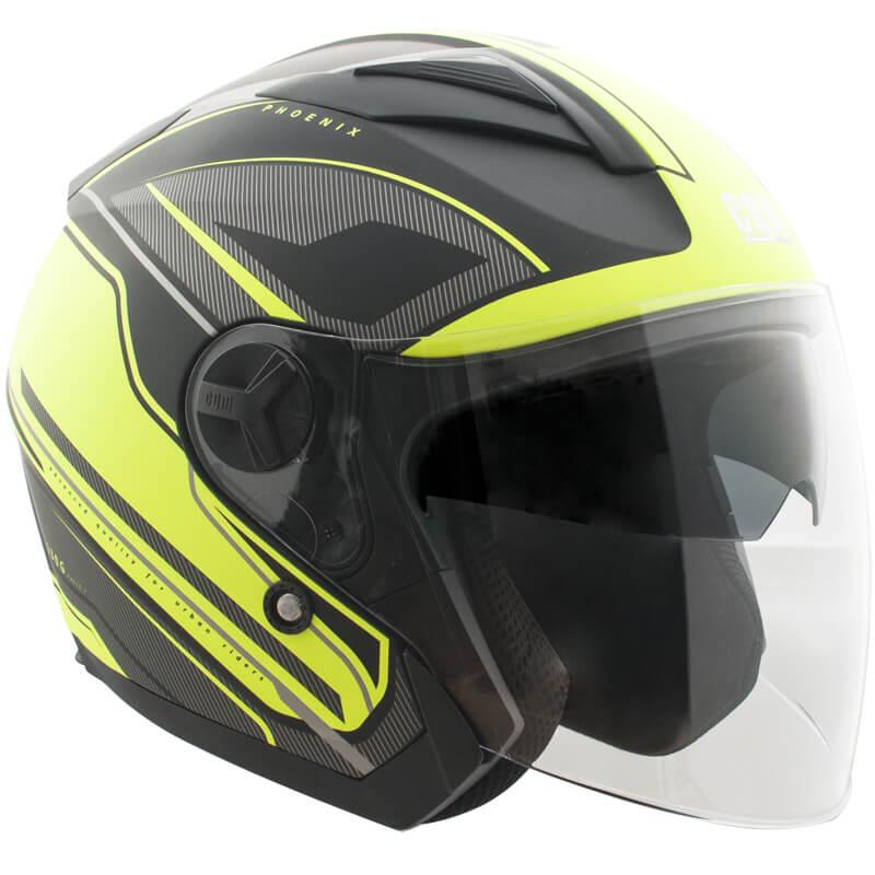 Le casque de scooter Phoenix 130G est fabriqué en deux tailles de coque extérieure pour améliorer le confort de chaque taille et est équipé d'une longue visière externe pour une meilleure protection contre le vent et de lunettes internes rétractables extra-fumées. Il est également équipé d'un système d'aération qui utilise les prises d'air avant pour canaliser l'air à l'intérieur du casque et expulser l'air chaud des extracteurs arrière. L'intérieur perforé, amovible et lavable est enrichi de bandes réfléchissantes arrière pour améliorer la sécurité passive.
