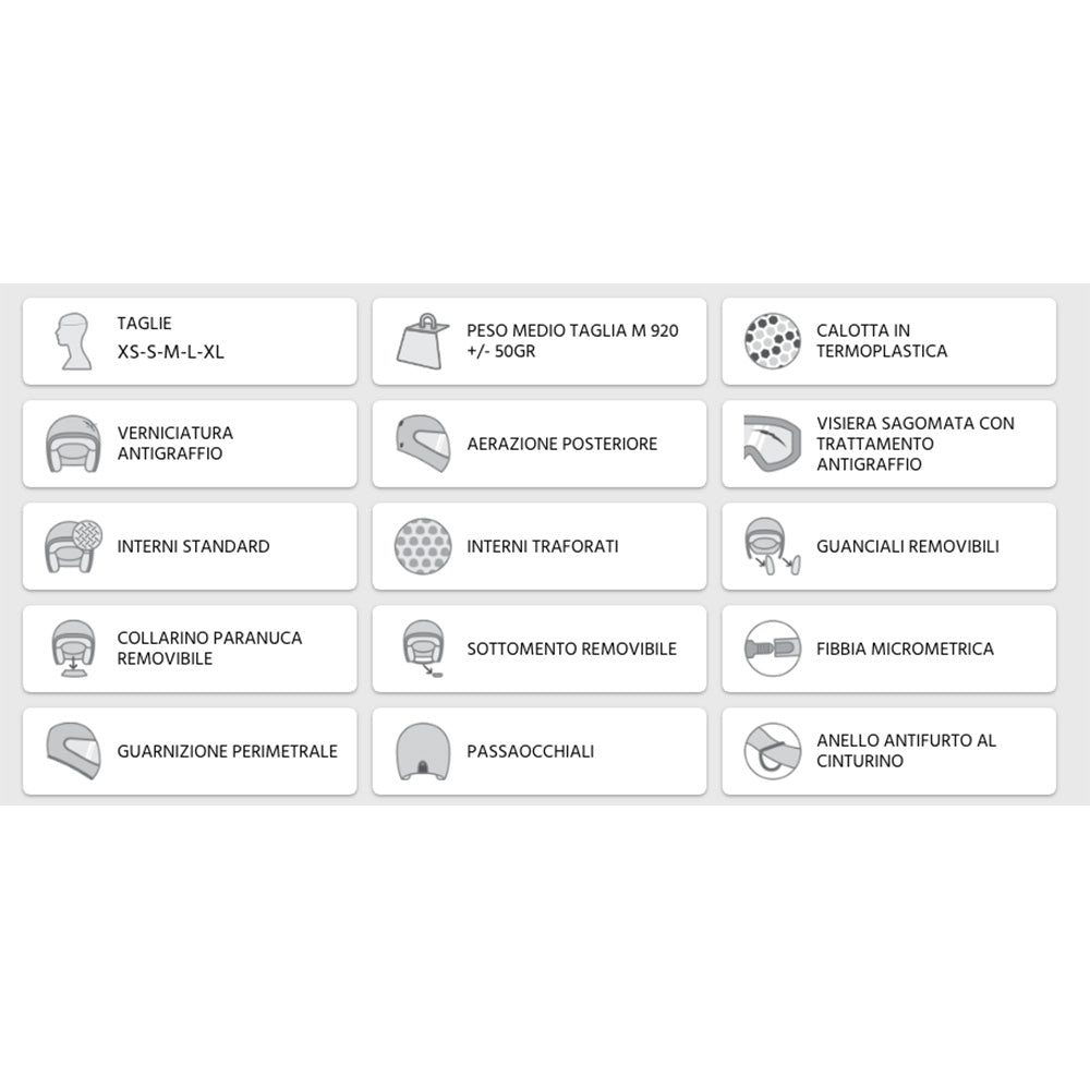 Extrêmement compact et léger, le casque scooter Florida 109A se distingue du casque sphérique classique grâce aux découpes arrière de la coque qui abritent également les extracteurs d'air. équipé d'un col amovible avec zip et d'une visière profilée.