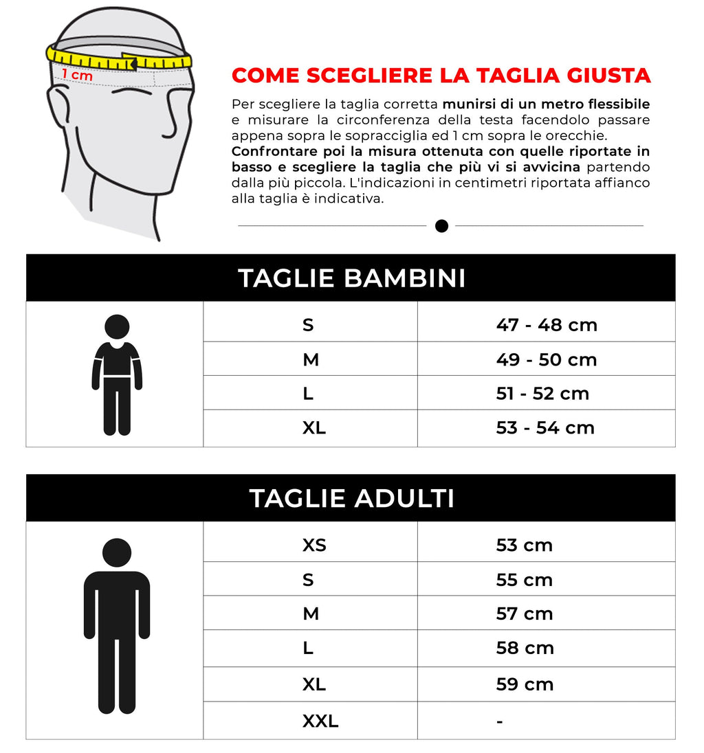 Pour choisir la bonne taille, utilisez un mètre ruban souple et mesurez le tour de tête en le passant juste au dessus des sourcils et 1 cm au dessus des oreilles. Comparez ensuite la mesure obtenue avec celles indiquées ci-dessous et choisissez la taille qui se rapproche le plus de vous en commençant par la plus petite. Les indications en centimètres indiquées à côté de la taille sont indicatives.