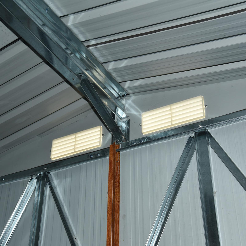 - TOIT EN PENTE: La remise à outils est équipée d'un toit en pente, qui assure l'écoulement de l'eau pour éviter la rouille. ENTREES D'AIR : Les deux entrées d'air frontales favorisent une ventilation optimale à l'intérieur de l'abri, pour éloigner l'humidité.