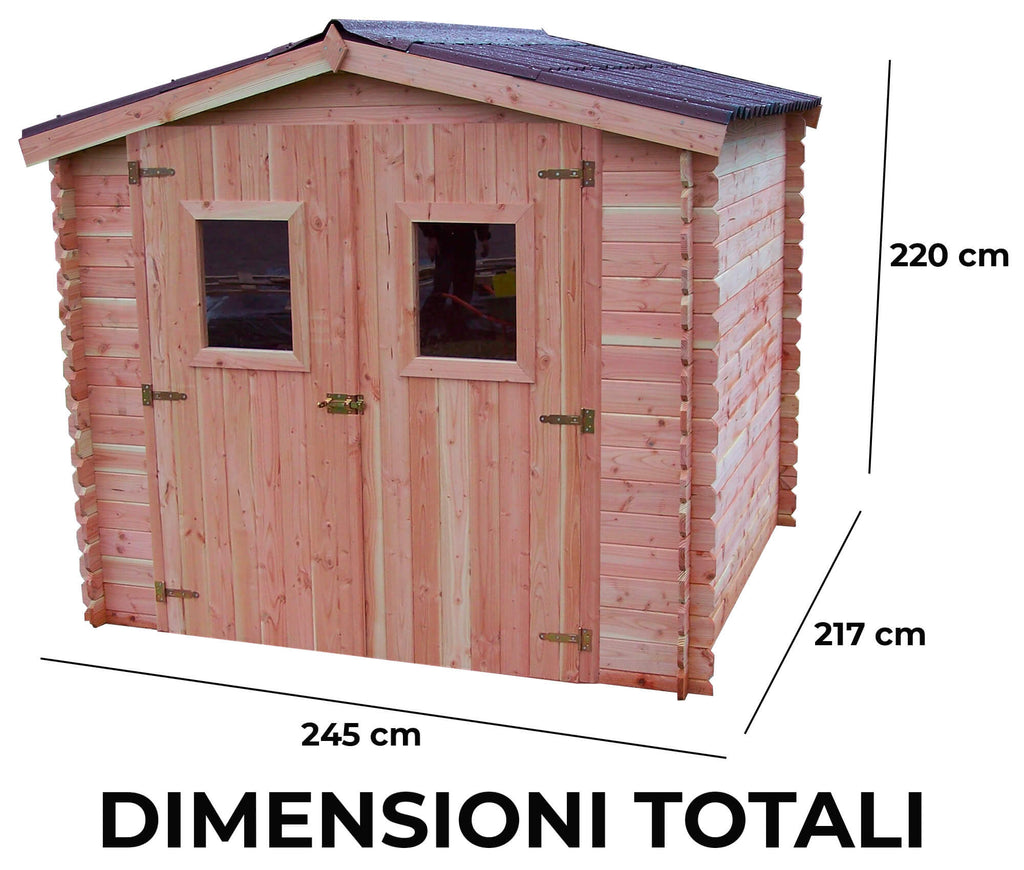 • Pareti: Tavolame scanalato con linguette in massello, spessore 28 mm. Taglio chalet per un assemblaggio delle pareti ad angolo solido ed impermeabile. Taglio smussato all'estremità del tavolame.