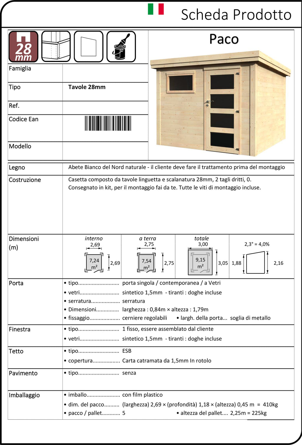 Abri de Jardin pour Outils 3x3,05m Sans Sol en Bois de Sapin 28mm Paco