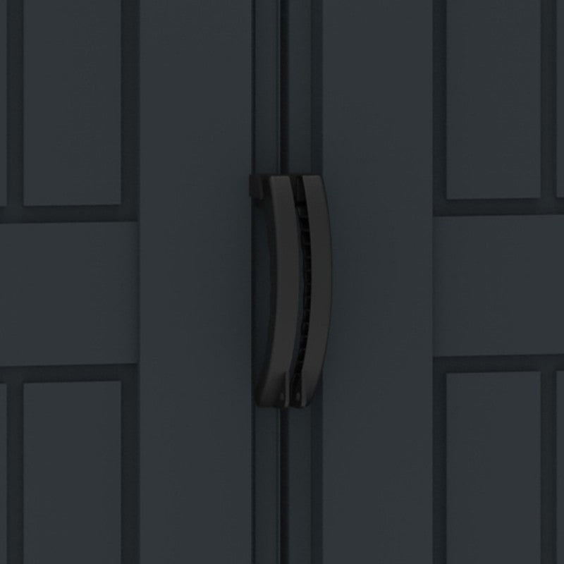 L'abri de jardin en PVC comprend un sol durable, une large porte à double ouverture , des poignées de porte à œillets verrouillables, des colonnes murales solides renforcées en métal pour accrocher facilement des étagères ou des outils et une grille d'aération comme grille à fentes sur le tympan. Idéal pour les petits patios ou cours. Conçu pour durer toutes les saisons avec la résine vinyle la plus durable.
