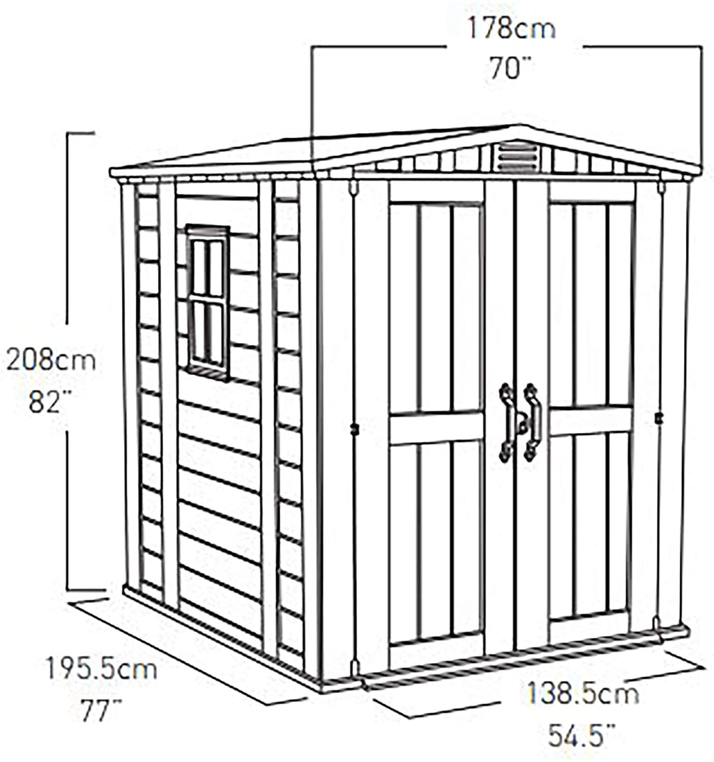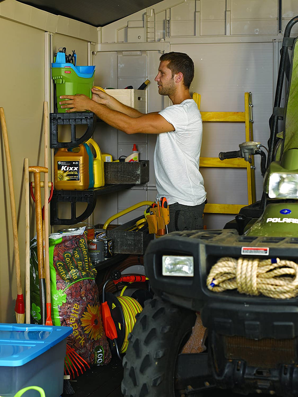Gardez votre jardin propre et bien rangé avec le cabanon Factor 4x6 résistant aux intempéries et sans entretien, avec une grande entrée à double porte pour un accès facile, un grand puits de lumière et une fenêtre latérale pour la lumière naturelle, des trous de ventilation et un plafond suffisamment haut pour permettre un accès confortable au cabanon . La maison comprend également deux étagères pour une meilleure répartition des espaces.