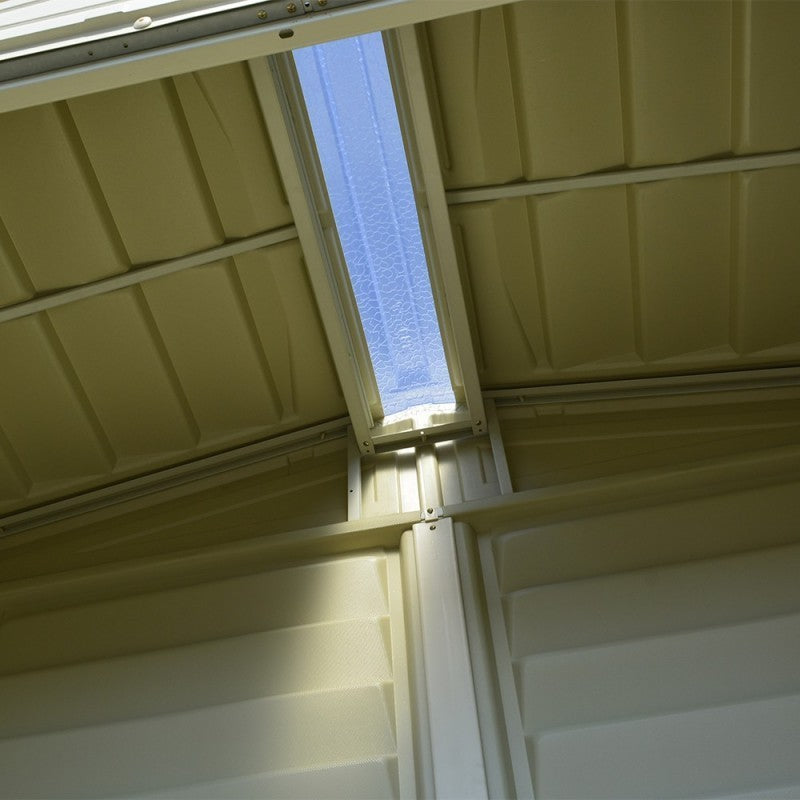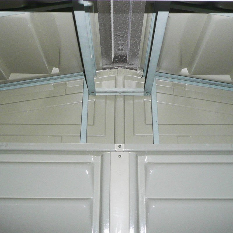 La maisonnette est soutenue par des poutres internes en acier galvanisé durable. Les parois latérales sont également renforcées par une solide structure métallique, qui confère de la résistance aux abris et permet le montage d'étagères et la fixation d'outils de jardinage. Ces maisons sont testées pour résister à des vents forts (jusqu'à 180 km/h si elles sont correctement ancrées au sol) et à une charge de neige allant jusqu'à un maximum de 100 kg/m2. Ces cabanons de qualité sont garantis 15 ans (la plus longue garantie de l'industrie !).