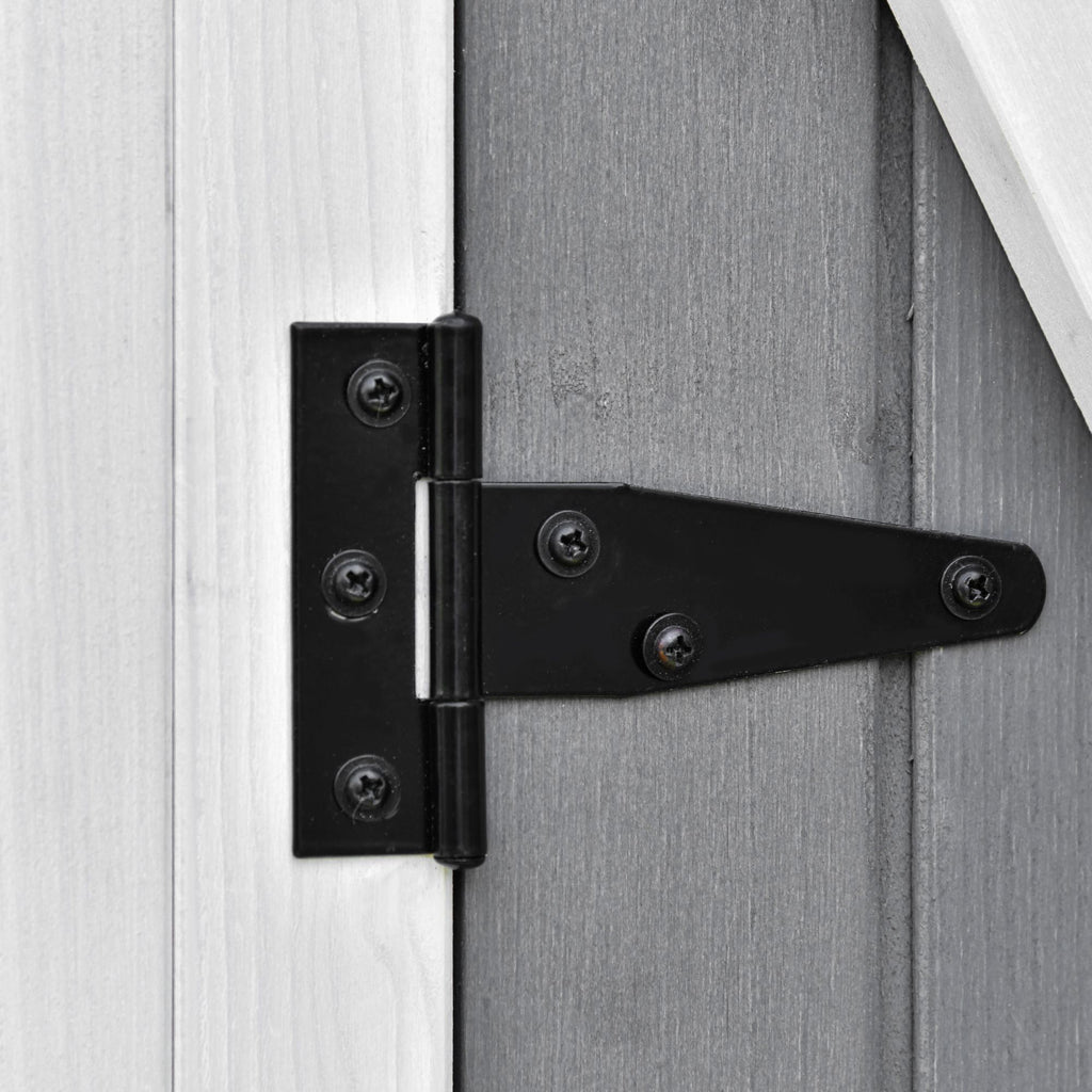 - STABLE : Notre remise à outils se démarque des autres par les fixations des pieds en forme de L avec piquets au sol, qui permettent de la maintenir stable et de résister au vent. Les charnières renforcées sur la porte aident à prolonger la durée de vie de la remise.