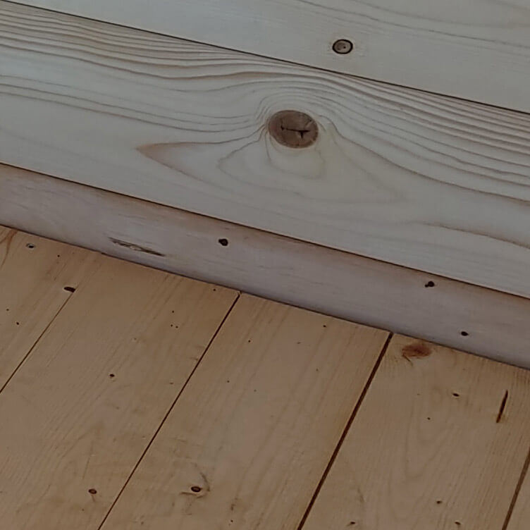 - Plancher en lambris sapin naturel épaisseur 19 mm avec lattes de support imprégnées en autoclave
