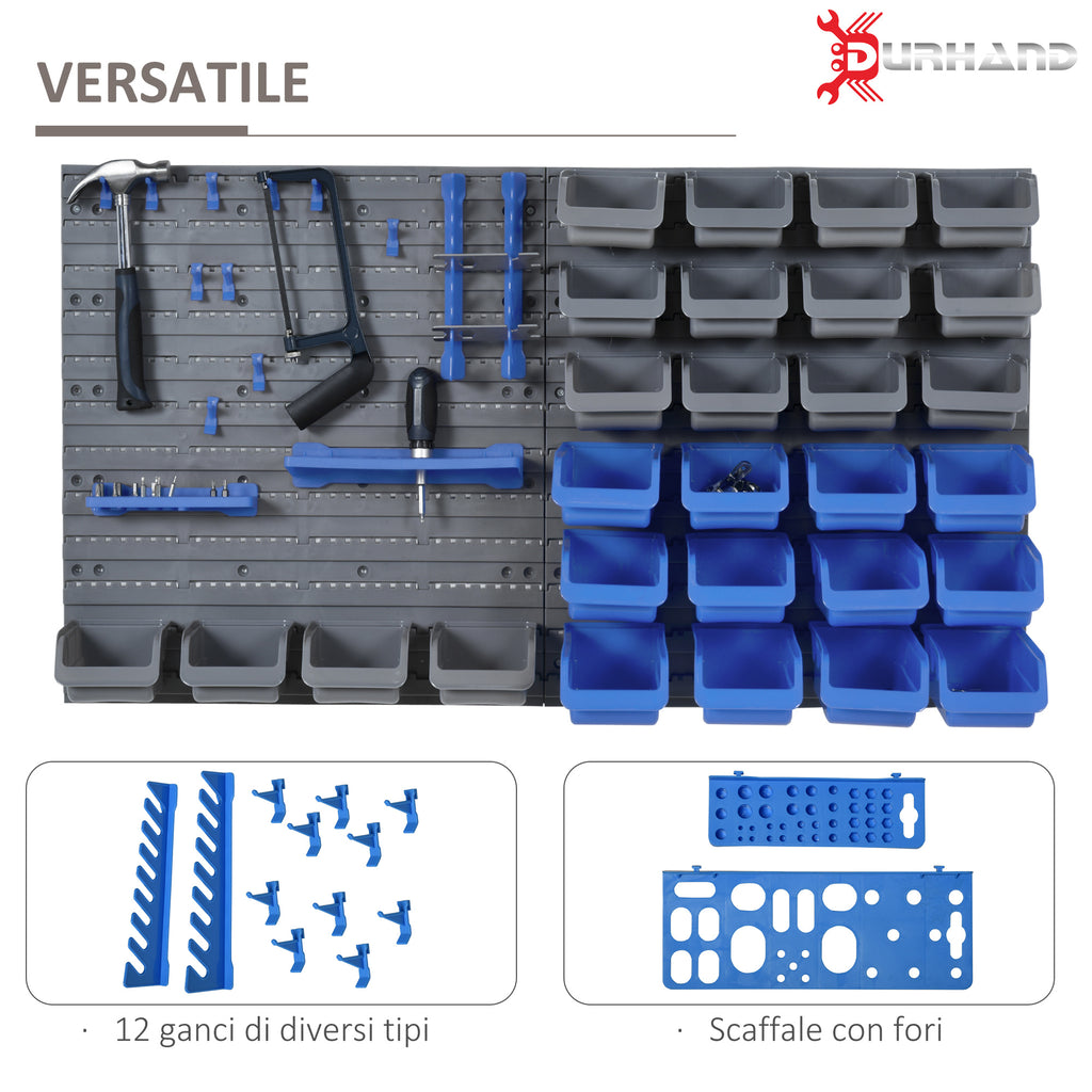 Cette boîte à outils de 44 pièces vous aidera à garder vos outils organisés et à portée de main. Il est fabriqué en PP durable et a une grande capacité de charge. Tous les conteneurs peuvent être retirés et disposés comme vous le souhaitez. Il peut être fixé au mur verticalement ou horizontalement et est parfait pour les pièces avec un espace limité. Les crochets de différents types conviennent aux outils et ustensiles tels que les tournevis, les marteaux, les vis, les écrous, les boulons, les clous et bien plus encore !