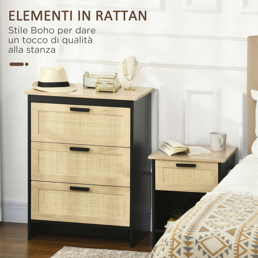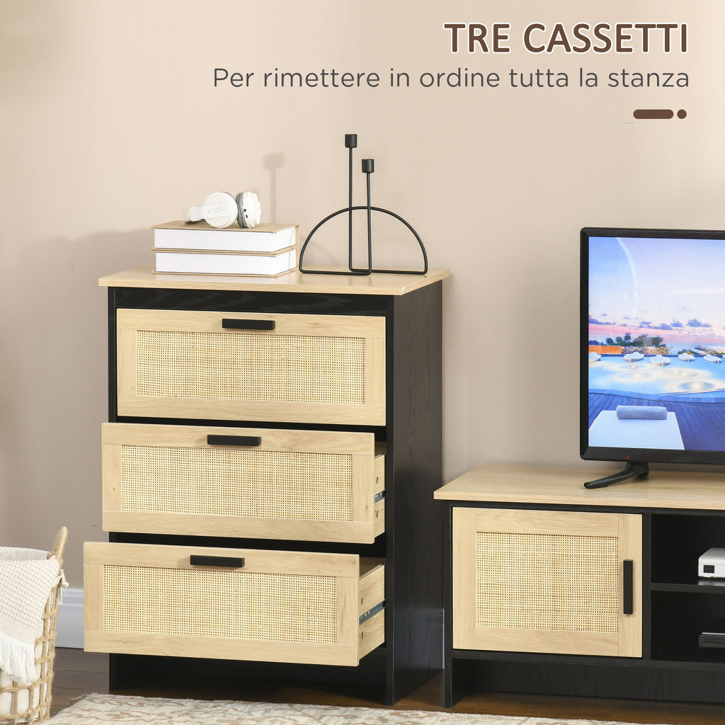 Cassettiera 3 Cassetti 60x40x80 cm in Truciolato e Rattan Nero e Color Legno
