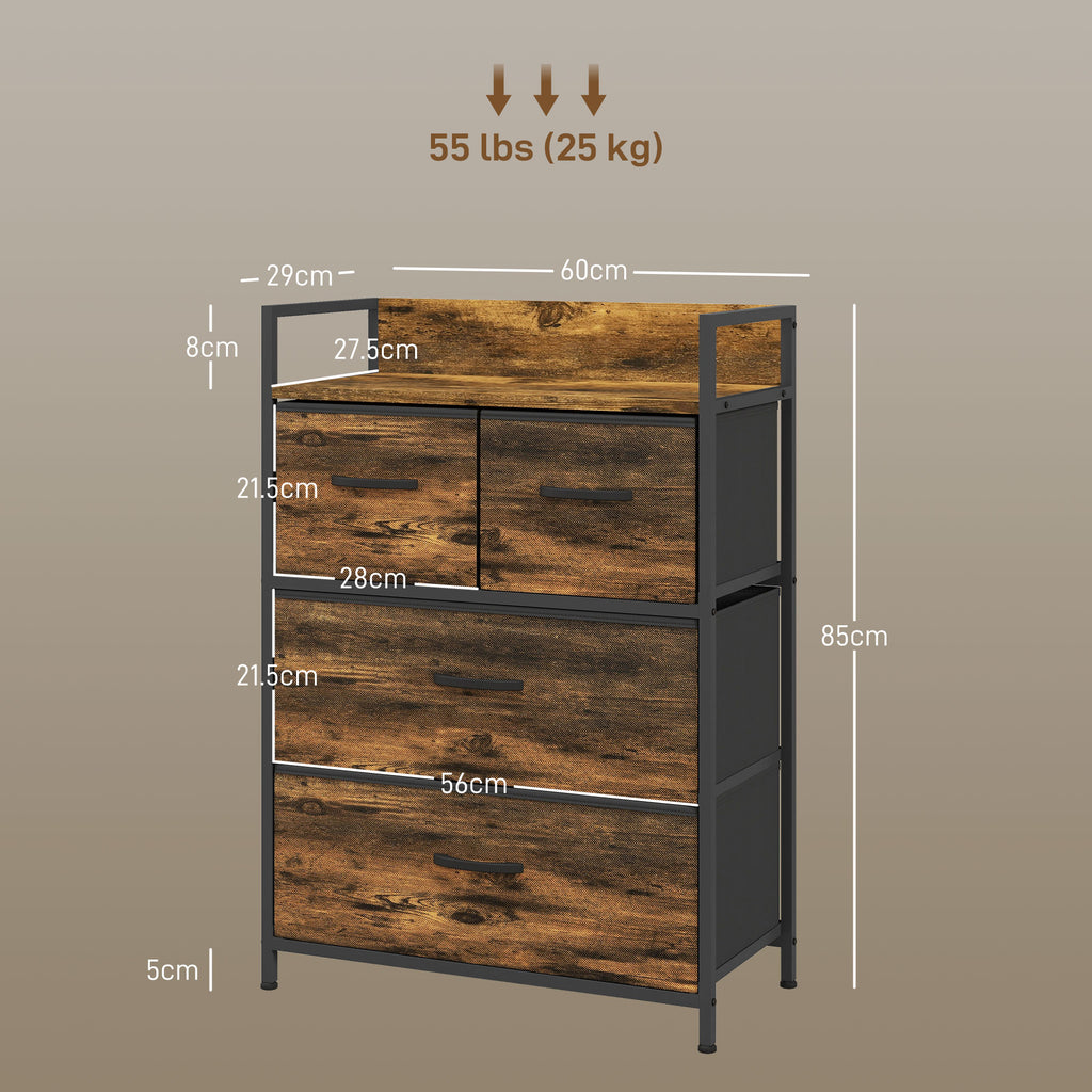 Cassettiera 4 Cassetti Design Industriale 60x29x85 cm in Acciaio Legno e Tessuto Marrone e Nero