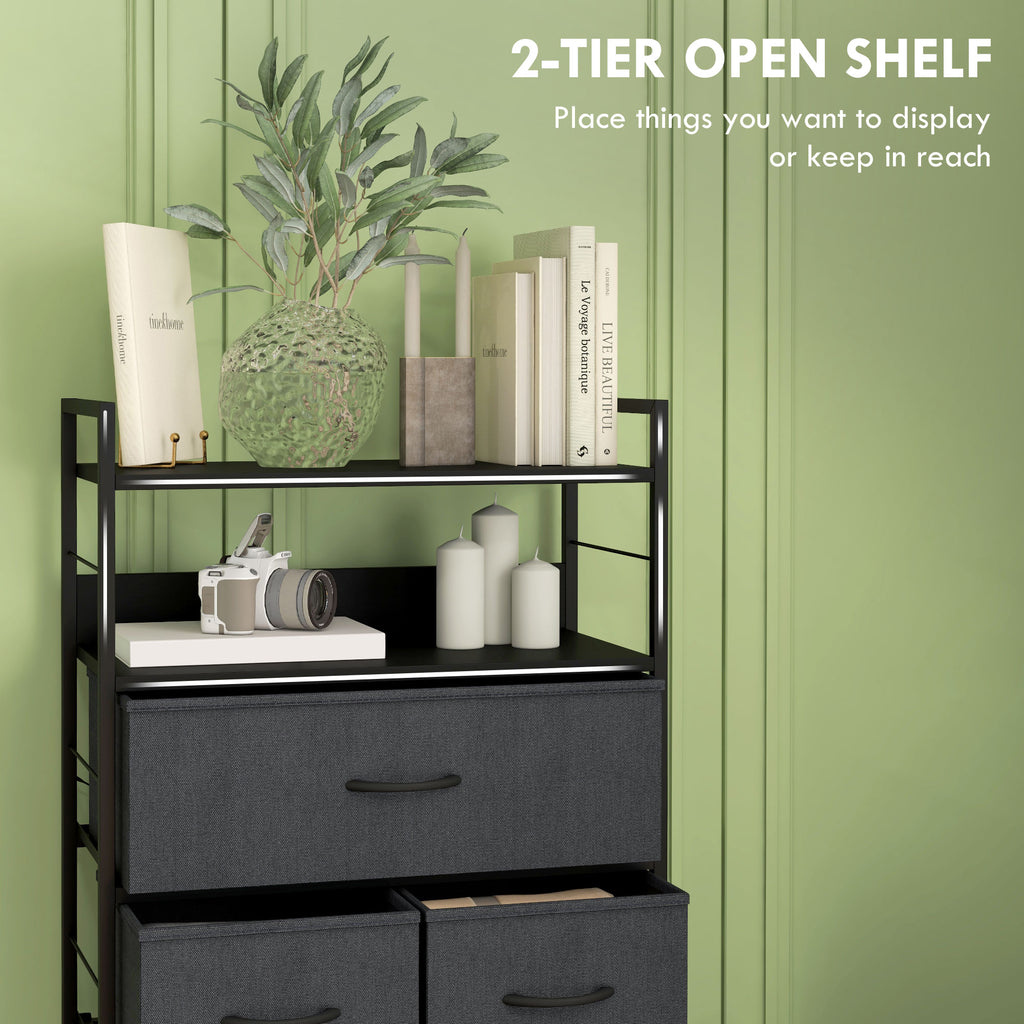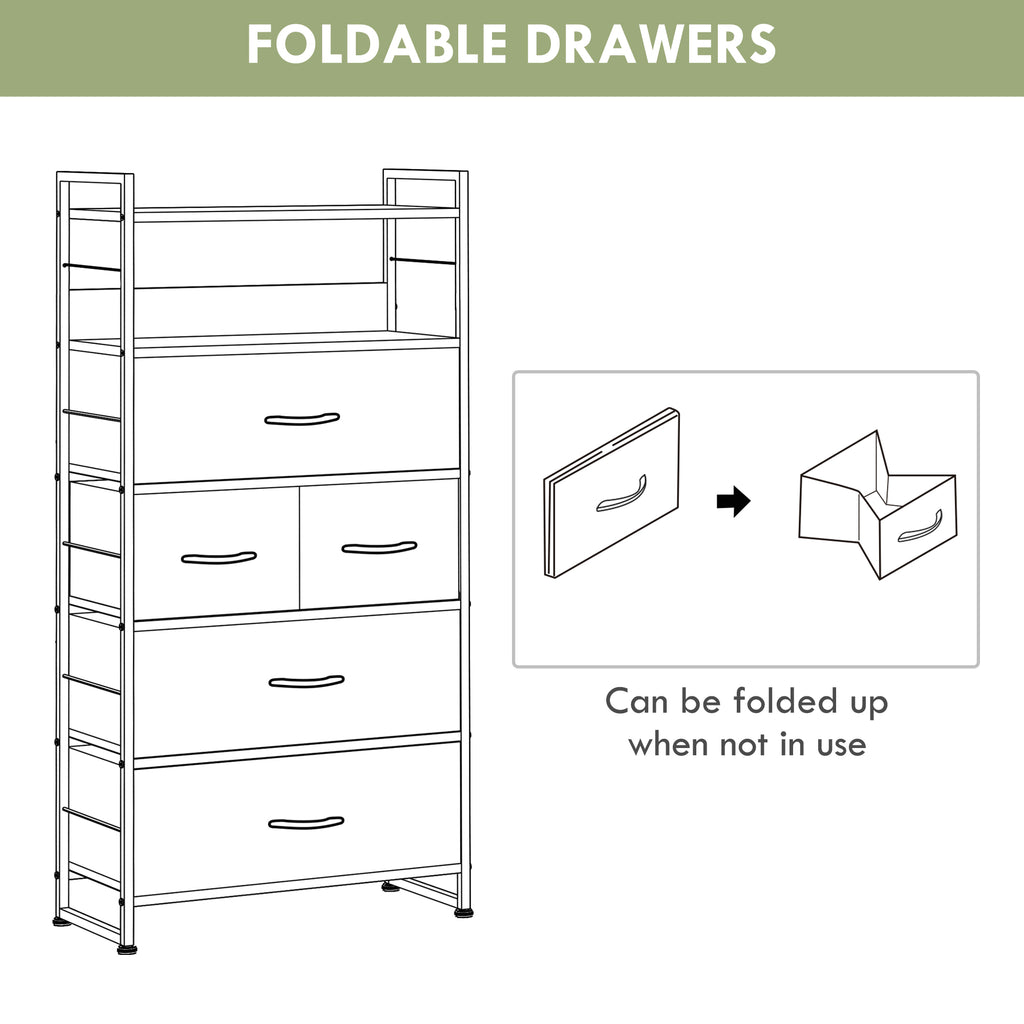 Sei alla ricerca di un modo per fare spazio in camera da letto? Il modo migliore per migliorare la tua organizzazione è munirsi di una cassettiera minimal e pratica. La cassettiera è dotata di 5 cassetti in tessuto non tessuto di diverse dimensioni per riporre i vari indumenti e di 2 ripiani per esporre lampade e soprammobili. Tutti i cassetti sono dotati di maniglie per aprirsi e chiudersi facilmente e possono essere rimossi e ripiegati quando non vengono utilizzati.