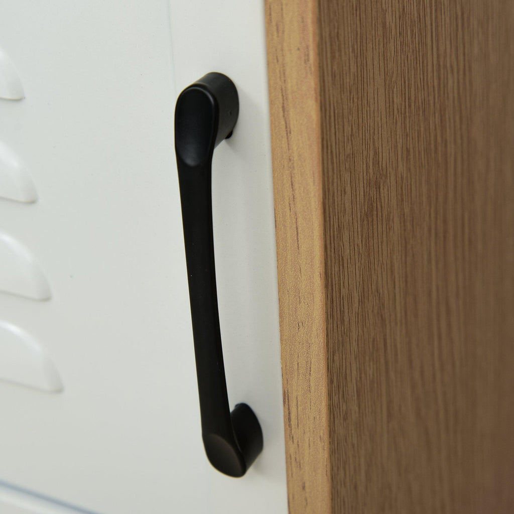- PORTES EN MÉTAL : Les deux portes sont en métal avec une finition blanche. Ils ont trois fentes dans la partie centrale, pour faciliter la circulation de l'air, et une poignée en métal noir.