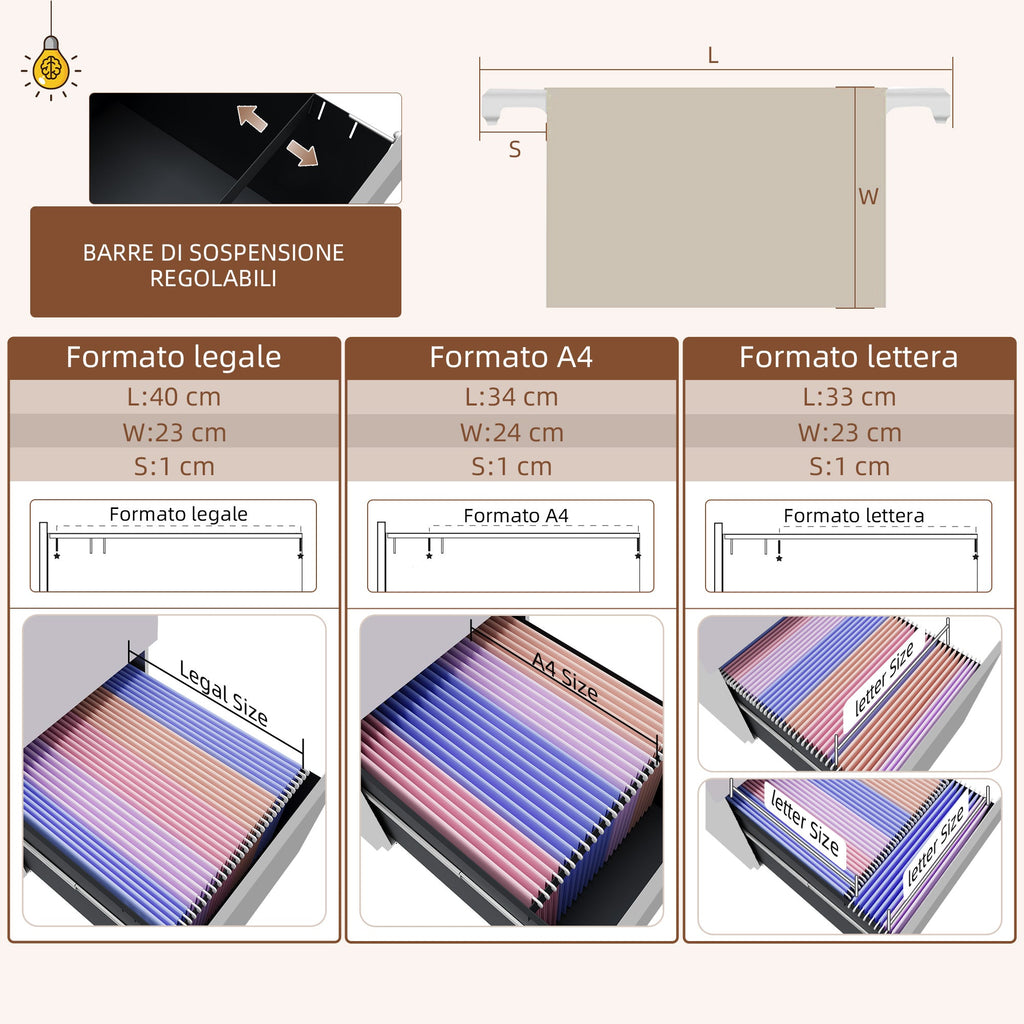 - ORGANIZZAZIONE: 2 piccoli cassetti con un vassoio per le matite offrono spazio extra nel nostro schedario per ufficio per riporre oggetti come come pinzatrici, forbici o carta per stampanti. Per evitare che i fogli importanti si accartoccino, il mobiletto da ufficio è dotato di una barra regolabile a 3 livelli nel cassetto grande, in modo da appendere le cartelle in formato lettera, A4 e legale