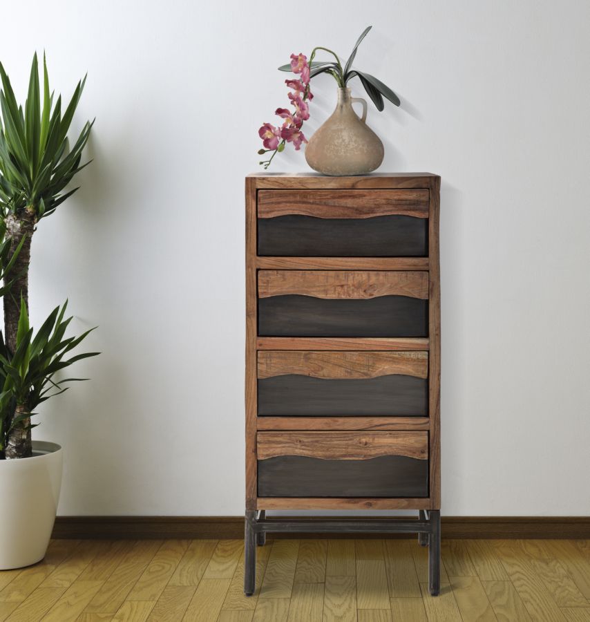 Commode en bois d'acacia massif avec 4 tiroirs. Le design ondulé particulier ainsi que les pieds en métal noir créent un design original et élégant pour une pièce extrêmement classique.