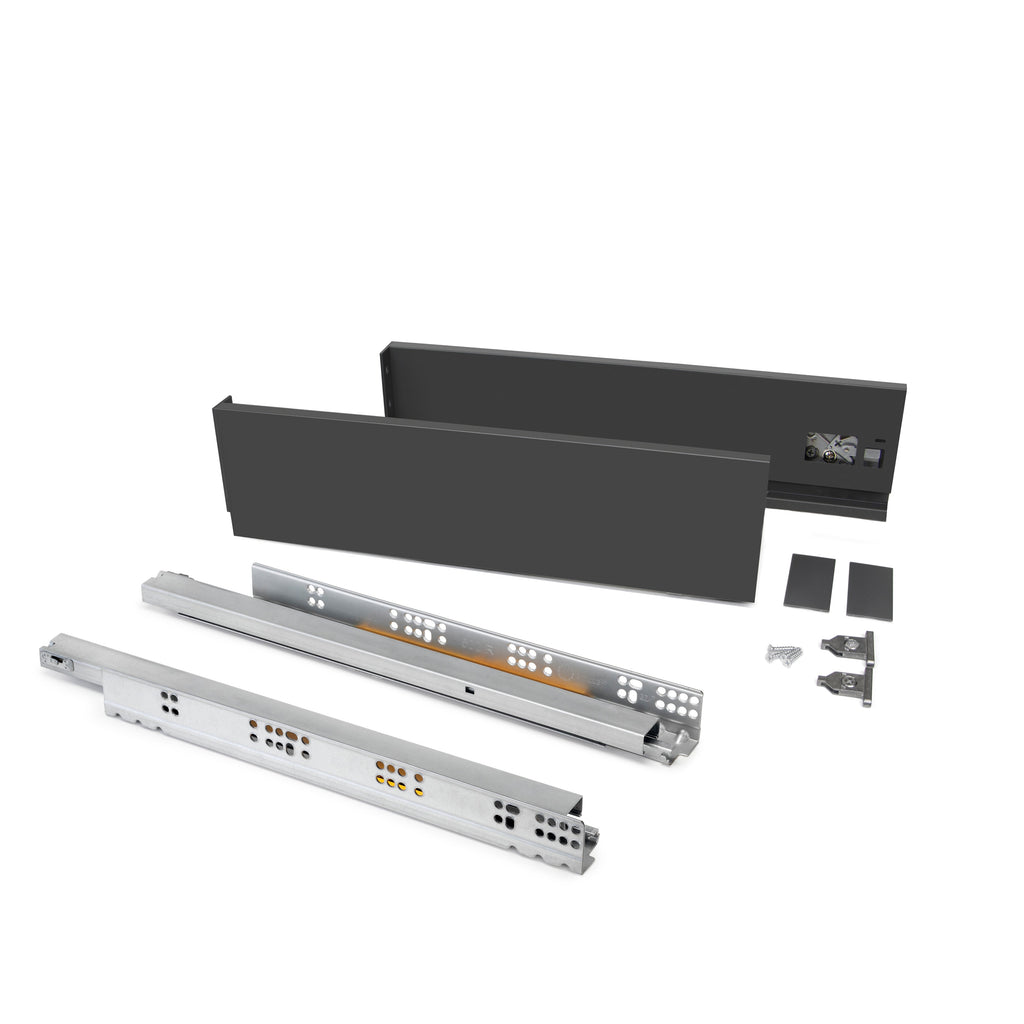 Kit tiroirs cuisine et salle de bain Vertex avec tous les éléments nécessaires à son montage. C'est la solution optimale pour vos meubles de cuisine, de salle de bain ou d'armoire au design élégant en gris anthracite et blanc . Chaque kit est constitué de tous les éléments nécessaires au montage d'un tiroir extérieur de 93 mm de hauteur en modules d'épaisseur latérale de 16 mm . Comprend : deux rails latéraux, un jeu de glissières à fermeture douce, un jeu de revêtements et de fixations pour la façade du tiroir.