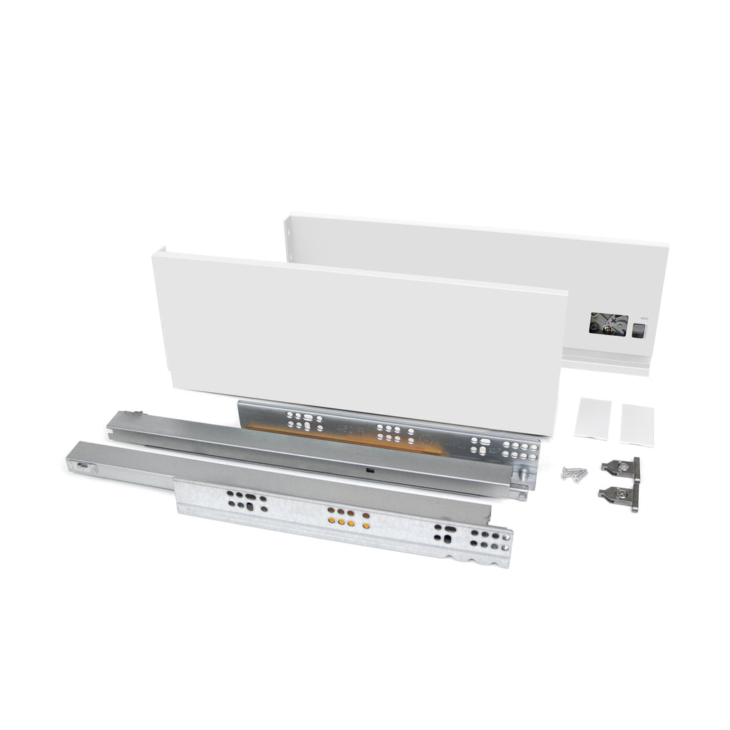 Kit tiroirs de cuisine et de salle de bain Vertex avec tous les éléments nécessaires à son assemblage.C'est la solution optimale pour vos meubles de cuisine, de salle de bain ou d'armoire au design élégant en gris anthracite et blanc . Chaque kit est constitué de tous les éléments nécessaires au montage d'un tiroir extérieur de 131 mm de hauteur en modules d'épaisseur latérale de 16 mm . Comprend : deux rails latéraux, un jeu de glissières à fermeture douce, un jeu de revêtements et de fixations pour la façade du tiroir.