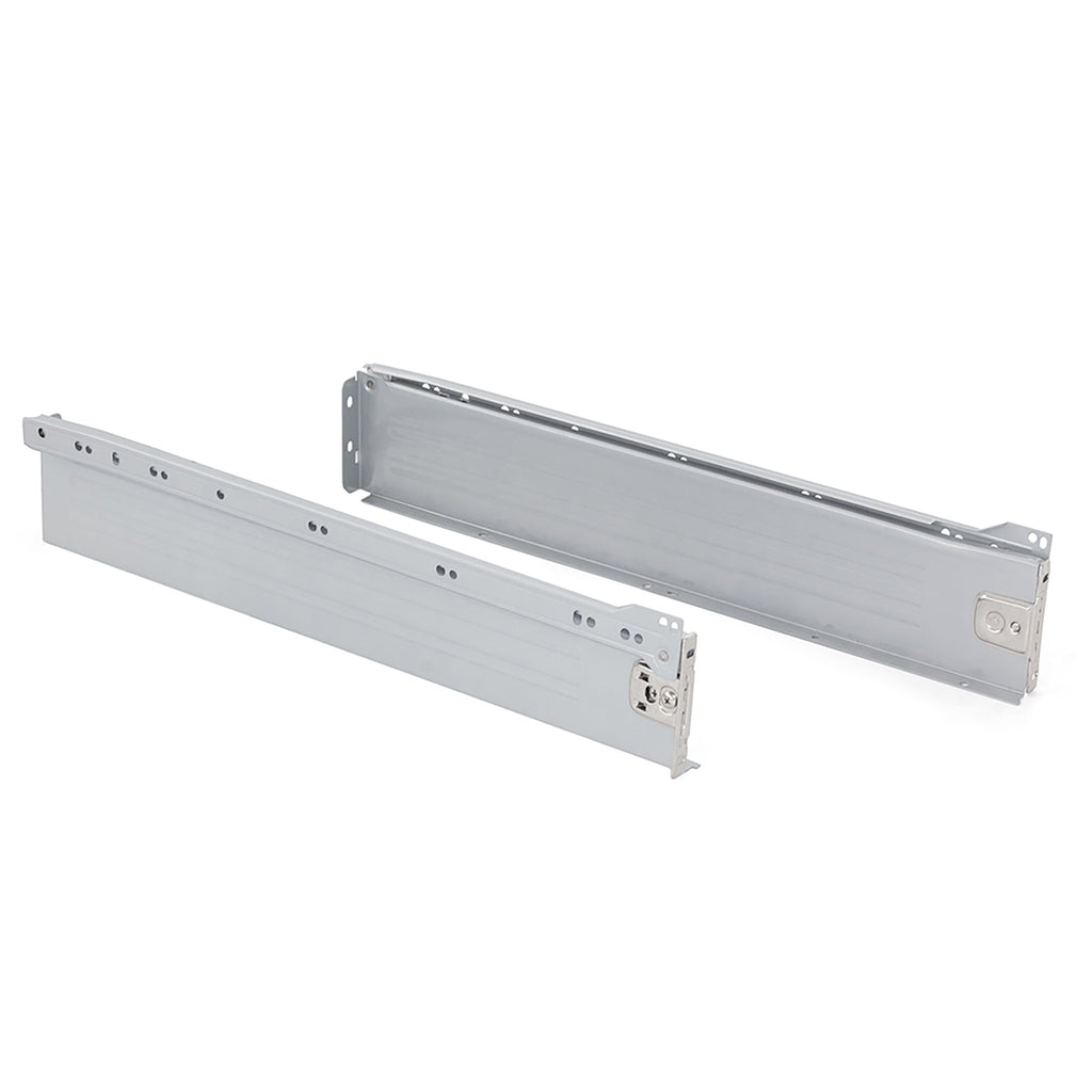 Le kit tiroirs de cuisine et de salle de bain Ultrabox se compose de profilés latéraux en acier avec guides à rouleaux, conçus avec des finitions peintes en aluminium . C'est l'option au meilleur rapport qualité-prix pour les tiroirs de cuisine et de salle de bain. Chaque kit comprend tous les accessoires pour assembler un tiroir : profilés latéraux, jeu de guides avec chute et crochets frontaux pour le panneau avant . Nécessite des panneaux coupés sur mesure pour le fond et le dos ainsi que pour la façade du tiroir. Les crochets de fixation du panneau avant permettent un réglage excentrique ± 2 mm vertical. Ces crochets sont déjà montés sur le côté du hayon en acier.