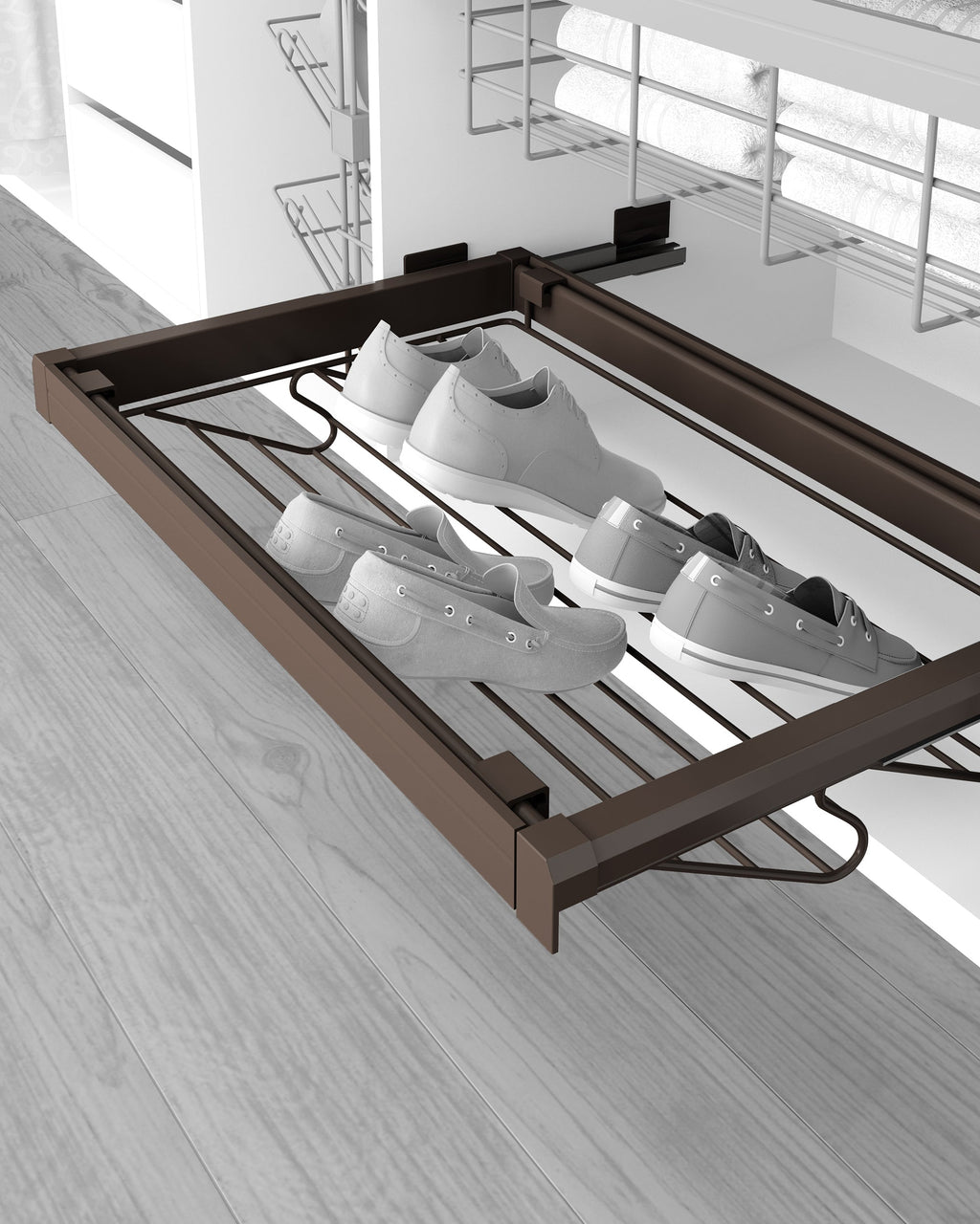 Kit composé d'un tiroir à chaussures et d'un cadre avec guides escamotables à extension totale et fermeture en douceur , il dispose également d'un système de clip automatique et rapide pour l'installation du cadre . Il est réglable pour s'adapter au compartiment interne de l'armoire et est réalisé en aluminium peint moka . Au lieu de cela, le tiroir à chaussures est en acier avec une finition peinte en moka .