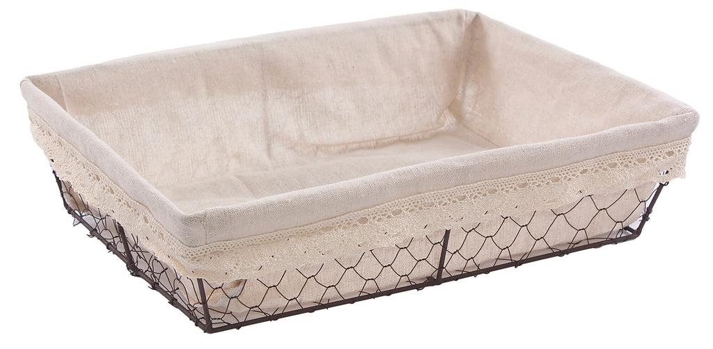 Cesto contenitore rettangolare. La struttura è in metallo realizzato a rete, fodera in cotone color ecrù. Ricrea un'atmosfera romantica e provenzale. La fodera è lavabile.