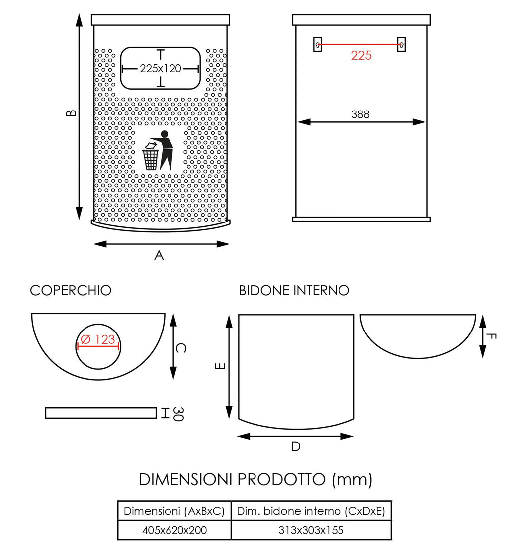 Corbeille avec cendrier semi-circulaire en acier micro-perforé avec un grand trou pour jeter le papier à l'avant. Poubelle interne amovible pour faciliter le vidage des déchets équipée de poignée. Deux supports sont positionnés à l'arrière pour une fixation murale. Couvercle supérieur avec plateau extincteur de cigarettes.