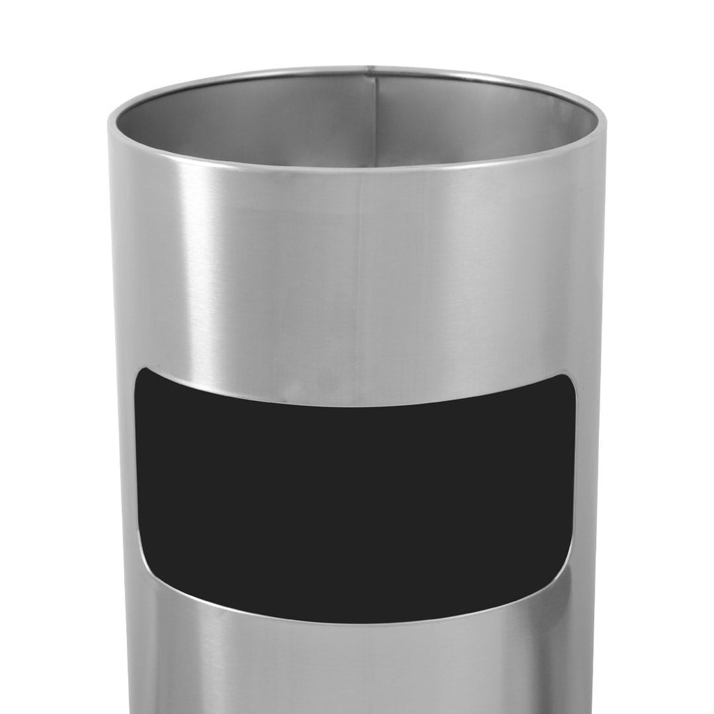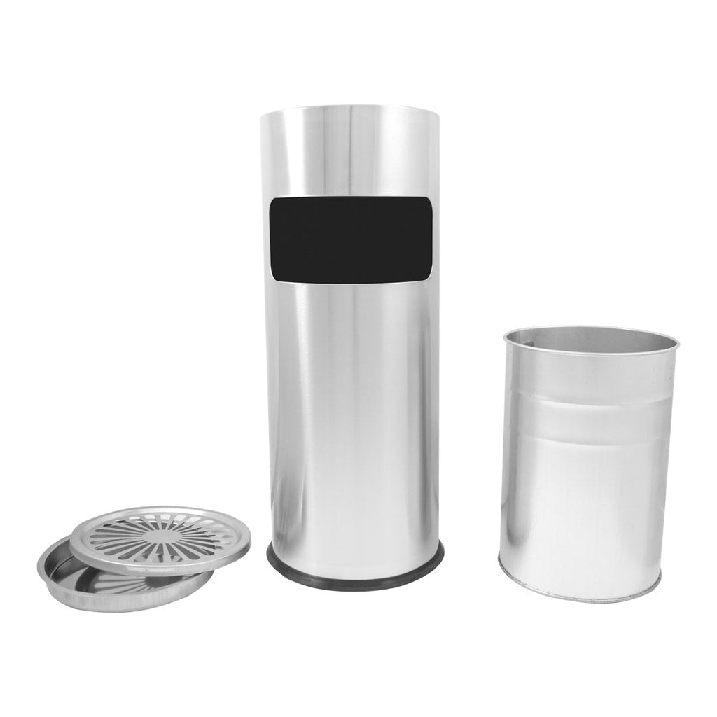 Corbeille à papier avec cendrier rond en acier équipé d'un grand trou pour papier frontal. La poubelle interne amovible facilite le vidage des déchets et est équipée d'une poignée.