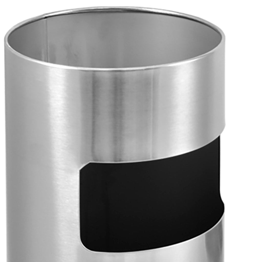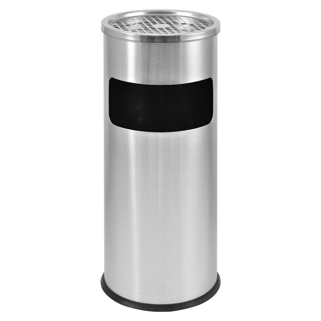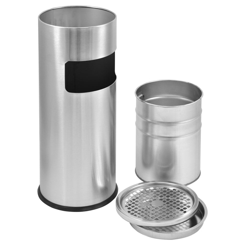 Corbeille à papier avec cendrier rond en acier équipé d'un grand trou pour papier frontal. La poubelle interne amovible facilite le vidage des déchets et est équipée d'une poignée.