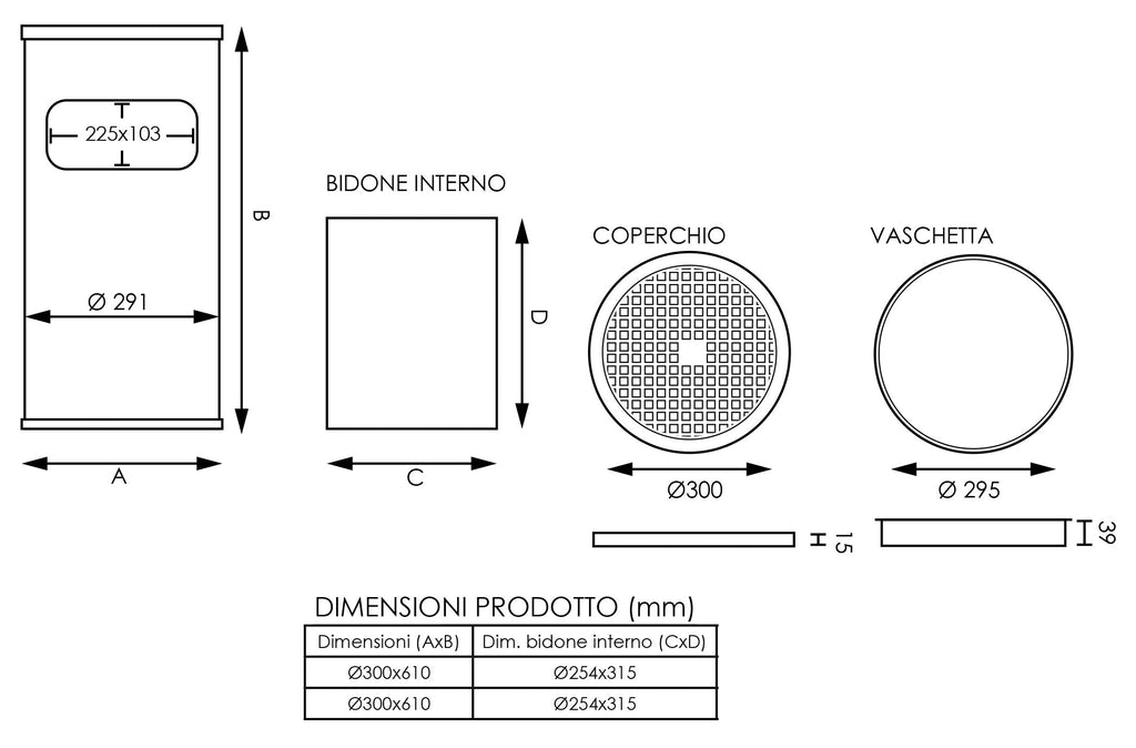 Corbeille à papier avec cendrier rond en métal thermolaqué noir mat avec grand trou frontal pour jeter le papier. La poubelle interne amovible facilite le vidage des déchets et est équipée de deux poignées.