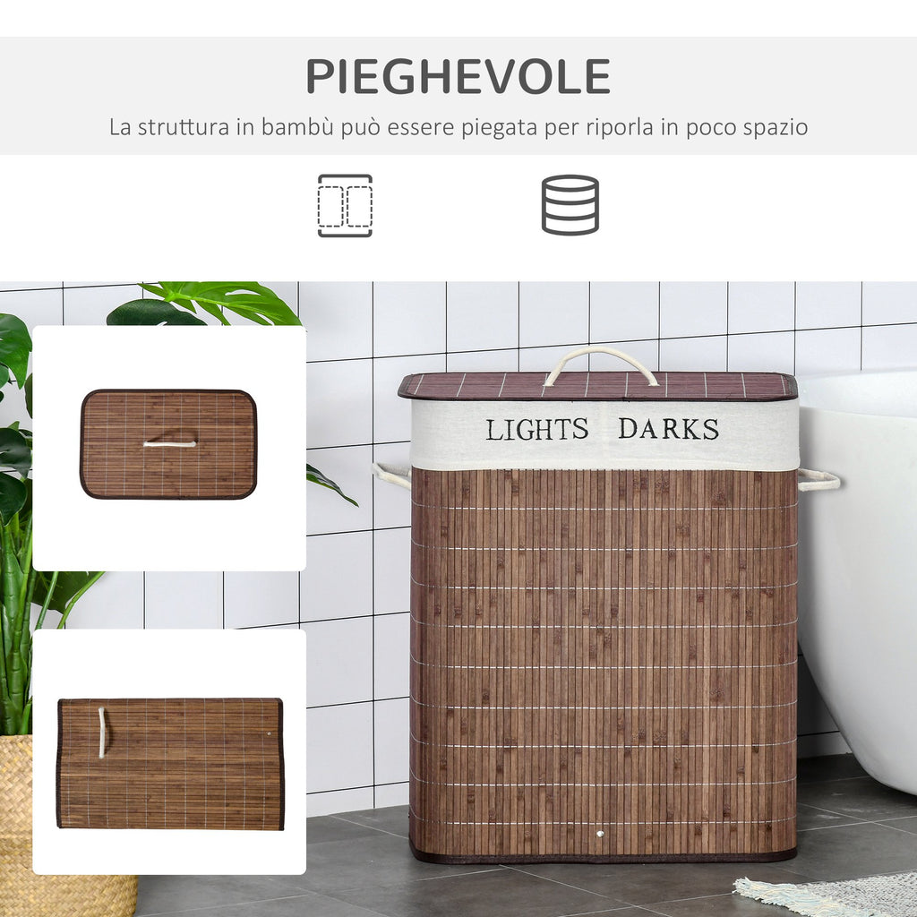 Panier à linge 2 compartiments 52x32x63 cm avec couvercle et poignées marron