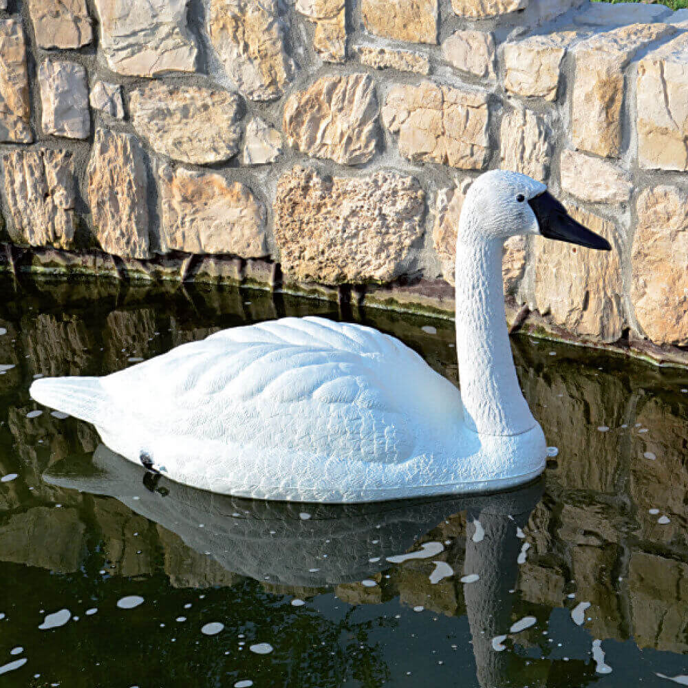 Belle reproduction flottante du cygne classique pour bassin de jardin, reproduction très réaliste et plausible en matériau résistant aux rayons UV et aux agents atmosphériques. Excellent pour repousser les hérons et les oiseaux prédateurs pour la protection des poissons de l'étang !