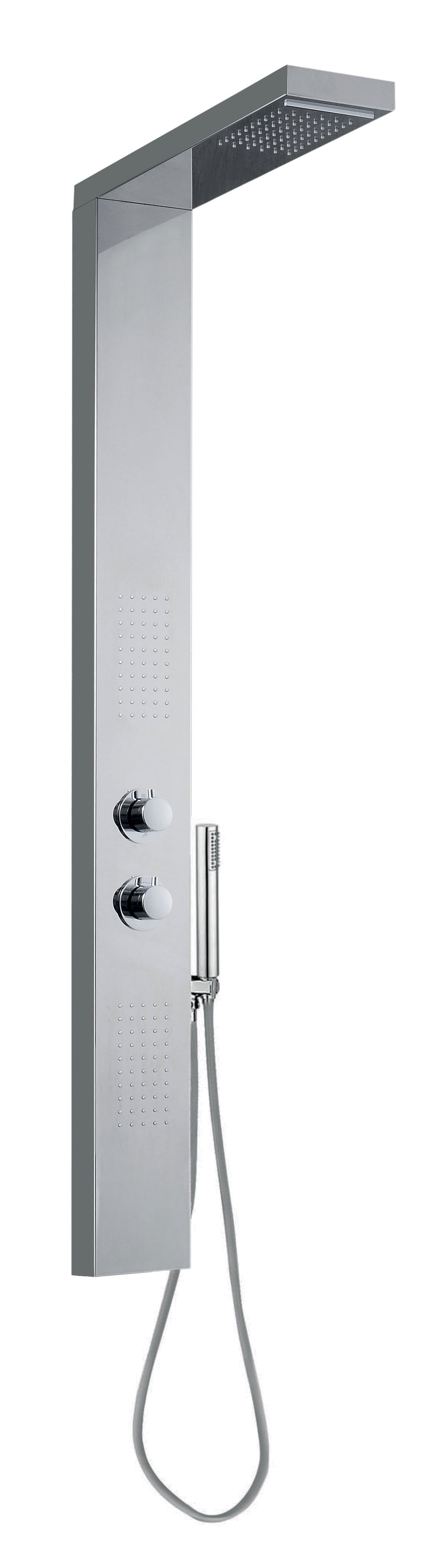 Il set colonna mezzo Totem Ermes è un'opzione sofisticata e moderna per il tuo bagno. La struttura è realizzata in inox super mirror, conferendo uno stile elegante e rifinito. Le dimensioni della colonna principale sono 1500x150x75 mm, affiancata da un pannello di 570x150x35 mm. Il miscelatore meccanico progressivo e il deviatore incorporati offrono un controllo preciso della temperatura e delle funzioni. Il set include la doccia Link, il soffione con funzione cascata e i getti frontali, garantendo un'esperienza di doccia completa e lussuosa. Il flessibile antitorsione da 150 cm Satilux aggiunge flessibilità al tuo sistema. Con Ermes, trasforma il tuo bagno in uno spazio contemporaneo e raffinato.
