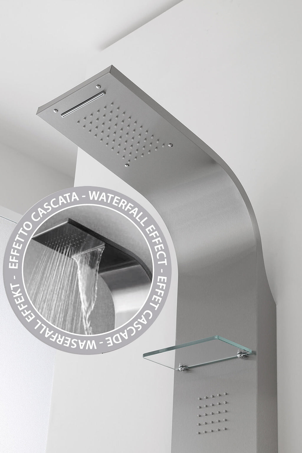 Colonne de douche en acier inoxydable satiné avec quatre fonctions sélectionnables : douchette à main, douche de tête, effet "cascade", jet "massage" horizontal.