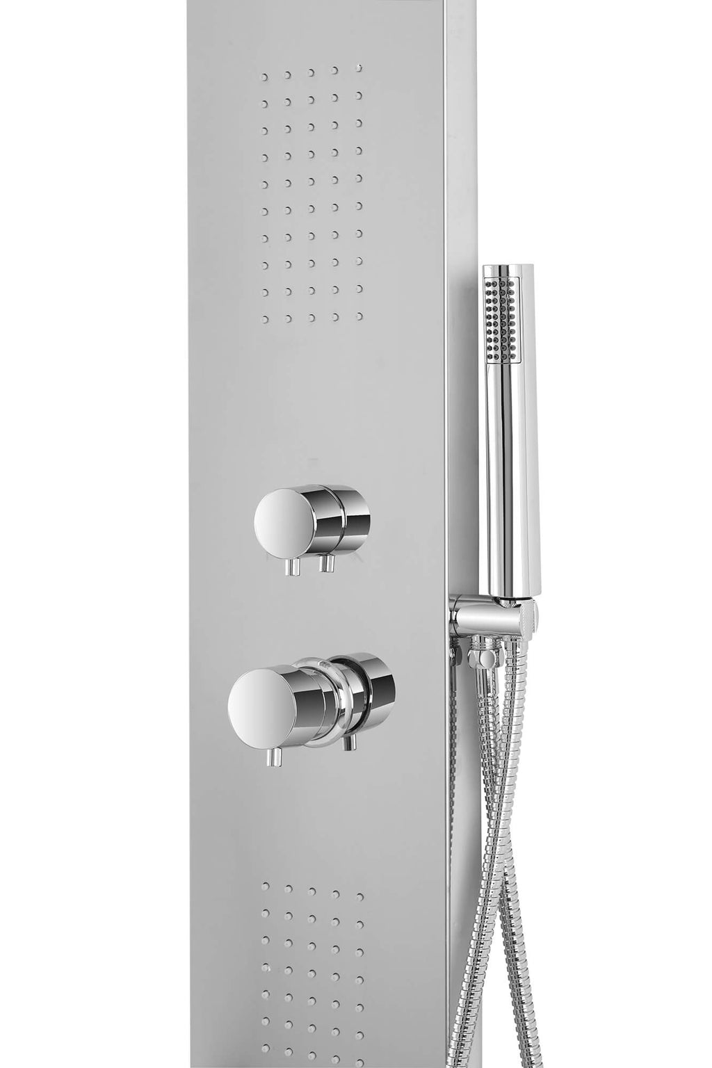 Colonne de douche en acier inoxydable avec trois fonctions sélectionnables : douchette à main, douche de tête, jet horizontal.