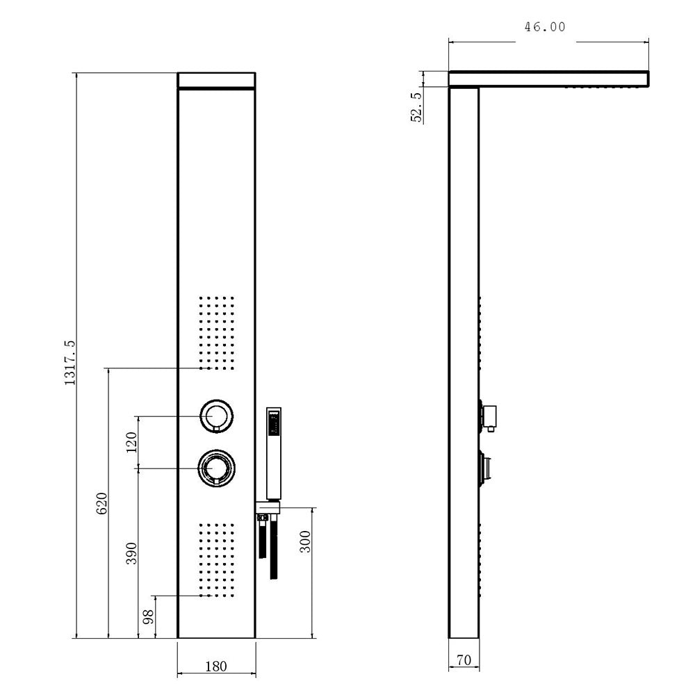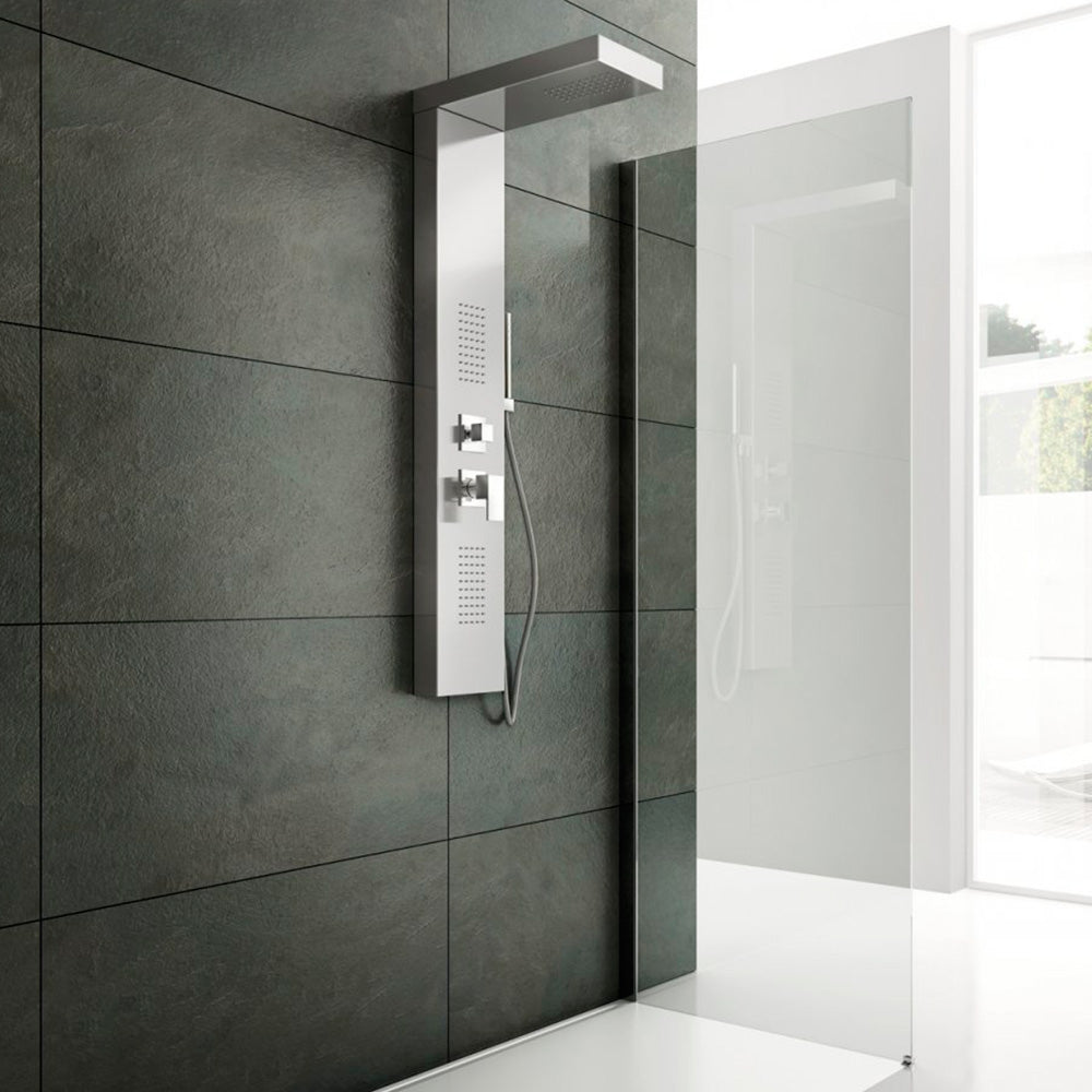 - Finition inox poli, corps de colonne de douche en inox poli, flexible ABS chromé, jets silicone anticalcaire.
