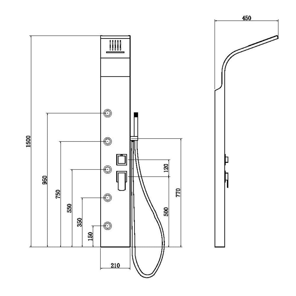 - Le corps du panneau de douche proposé est en acier inoxydable avec une finition brossée anti-traces de doigts, le flexible et la douchette sont inclus, le mitigeur 4 voies donne la possibilité de gérer le jet d'eau individuellement sur : pomme de douche, douchette douche, cascade cervicale et jets d'hydromassage.