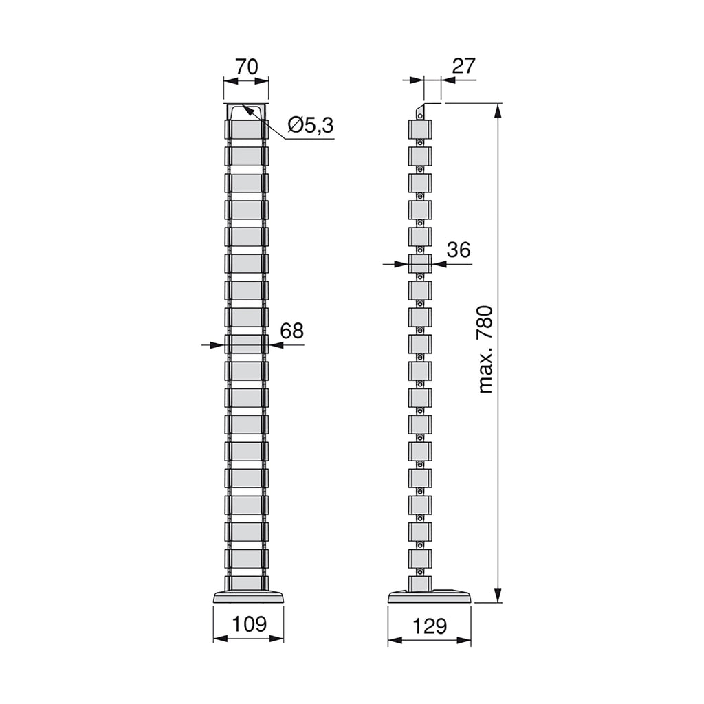 Colonne passe-câbles articulée de forme carrée Pipe 4 . Il vous permet de cacher les câbles des appareils électroniques dans les bureaux, les tables de travail et les meubles de maison. De cette façon, il permet d'organiser et de trier les câbles sous la table pour éviter les emmêlements. Le presse-étoupe est en plastique avec une finition peinte en aluminium . Il est livré démonté en trois parties et son montage est simple grâce aux accessoires à pression. Pouvoir adapter la hauteur avec les segments, jusqu'à un maximum de 780 mm.