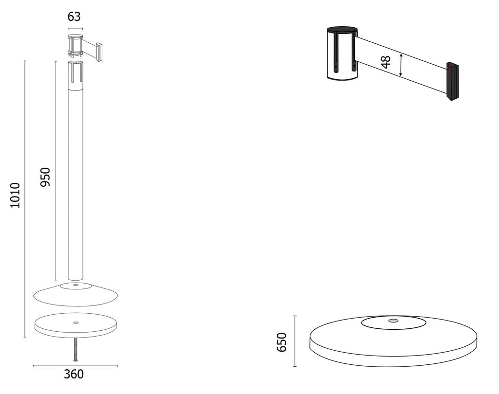 Colonne de ruban de 3 mètres en inox brossé Ø36x101 cm ruban jaune/noir