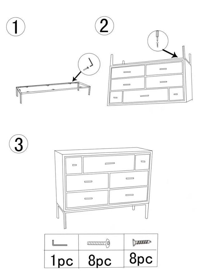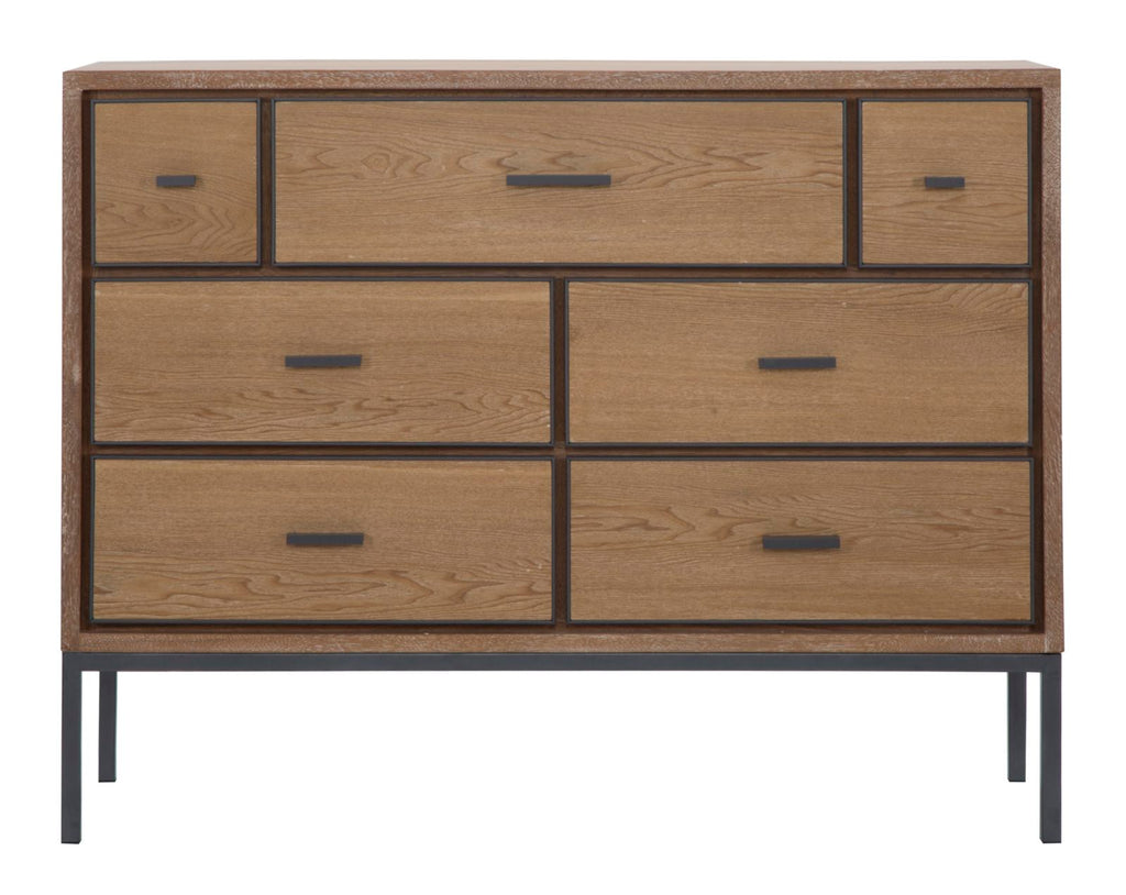 Commode en bois avec finitions en métal, poignées et pieds avec 7 tiroirs. Le design simple et carré associé à la finition particulière du plateau allie parfaitement élégance et raffinement.