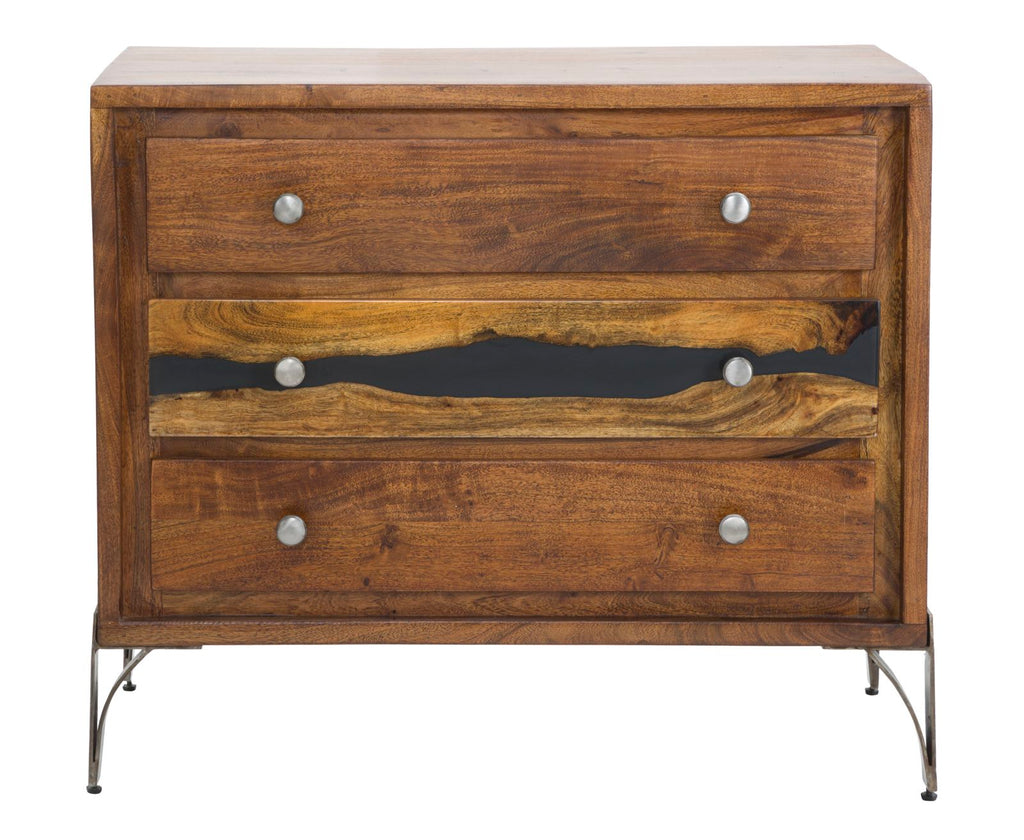 Commode élégante en bois d'acacia massif avec 3 tiroirs. La finition particulière avec de la résine fixée sur les tiroirs donne une touche de couleur et de modernité à une pièce extrêmement élégante et classique.