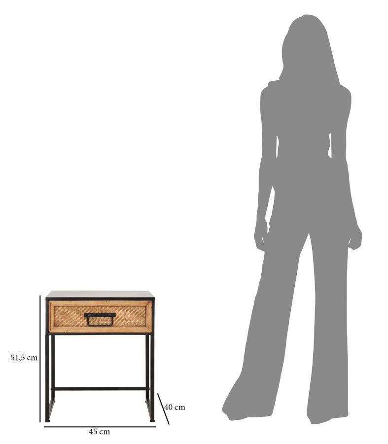 Table de chevet avec structure en métal noir et tiroir en bois avec une finition qui rappelle le tressage du rotin. Le design simple et linéaire en fait un élément pouvant être combiné avec tout type de mobilier.
