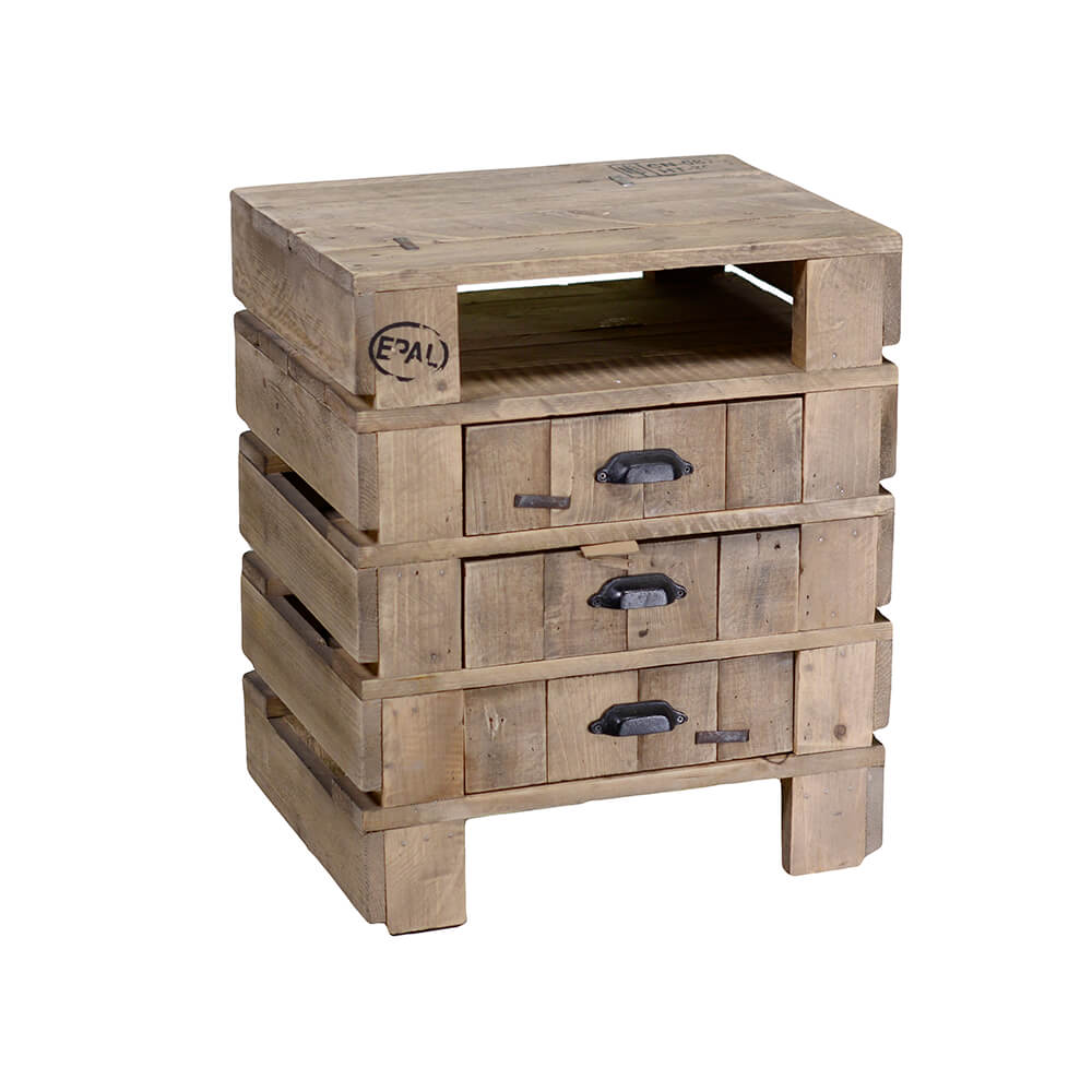 La table de chevet mobile 1 compartiment et 3 tiroirs en palette est le meuble idéal pour votre maison écologique et durable.Il convient à tous les types de mobilier et sera toujours un meuble dans l'air du temps.